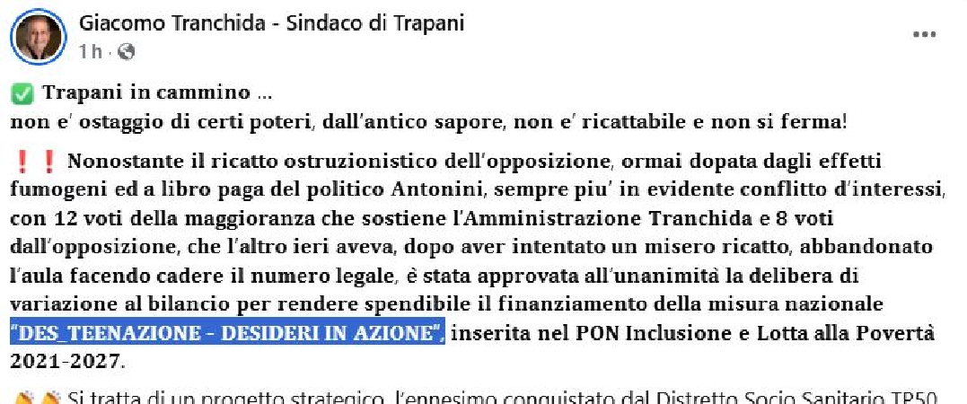 Il sindaco Tranchida non usa mezzi termini: «Nonostante il ricatto ostruzionistico dell’opposizione, ormai dopata da effetti fumogeni e in evidente conflitto d’interessi…». Il riferimento – neanche troppo velato – è al ruolo di Valerio Antonini, citato nel post pubblicato direttamente sul sito del Comune.