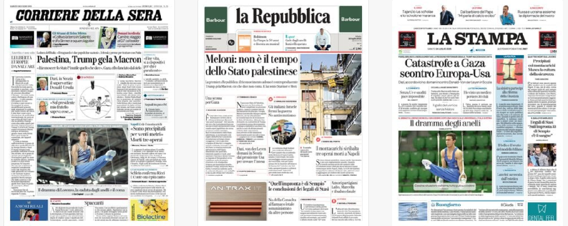 Titoli Corriere della Sera: Palestina, Trump gela Macron la Repubblica: Meloni: non è il tempo / dello Stato palestinese La Stampa: Catastrofe a Gaza / scontro Europa-Usa Il Sole 24 Ore: Corrono le entrate / nel bilancio dello Stato / 13,8 miliardi in più Avvenire: La luce dei migranti Il Messaggero: Aiuti a Gaza, sì ai lanci dal cielo Il Giornale: Macron spacca l’Occidente Qn: Palestina, Parigi va avanti / E Trump attacca Macron Il Fatto: Si sono persi 2 missili / nel mare di Sardegna Libero: Se le danno tra di loro La Verità: «Ho svelato il sistema di Ricci / mi vogliono togliere gli appalti» Il Mattino: Vite spezzate il Quotidiano del Sud: Palestina, lite Usa-Francia il manifesto: In difesa Domani: Palestina, Trump bullizza Macron / Sui dazi intesa Usa-Ue a un passo