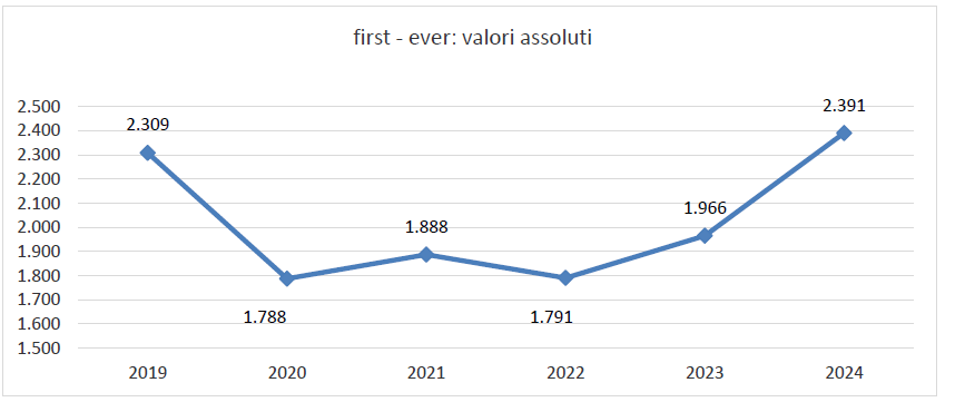 Gli utenti che sono venuti in contatto per la prima volta in assoluto con i servizi ambulatoriali del DSM ammontano a n. 2.391 in aumento del 21,6% rispetto al 2023. Il grafico seguente mostra l’andamento negli ultimi 6 anni: