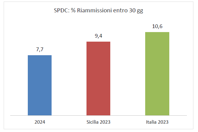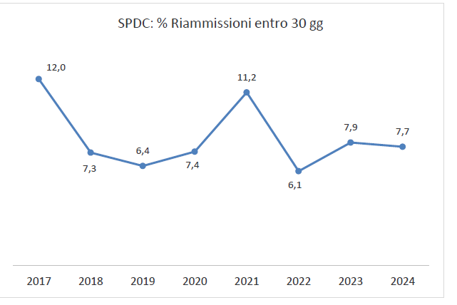 5. Se ad un paziente viene effettuato un TSO dove viene ricovero? In caso di Trattamento Sanitario Obbligatorio (TSO), il paziente viene ricoverato in una struttura ospedaliera dotata di un reparto di Psichiatria autorizzato a gestire questo tipo di intervento. Nell’ambito dell’ASP di Trapani o Alcamo; in caso di indisponibilità di posti letto, il ricovero avviene negli altri SPDC della Regione. 6. In che misura è garantita la continuità assistenziale nei percorsi di cura dei pazienti con disturbi psichici gravi (es. schizofrenia, disturbi bipolari)? Quali indicatori di performance clinica e organizzativa vengono utilizzati per monitorare l’efficienza e l’efficacia dei servizi erogati? La continuità assistenziale per i pazienti con disturbi psichici gravi, come schizofrenia e disturbo bipolare, è una priorità strategica. Il sistema è strutturato per garantire una presa in carico stabile e duratura, attraverso una rete integrata di servizi territoriali, semiresidenziali, residenziali e ospedaliera. La continuità assistenziale viene garantita attraverso l’elaborazione di piani terapeutici personalizzati condivisi con pazienti e famiglie, interventi multidisciplinari che coinvolgono psichiatri, psicologi, assistenti sociali, infermieri e la collaborazione con le istituzioni ed enti territoriali quali comuni, scuole, cooperative, associazioni.Un indicatore di performance utilizzato è la percentuale di riammissione in SPDC entro 30 giorni ed entro 7 giorni dalle dimissioni. La percentuale di riammissioni non programmate entro 30 giorni dalla dimissione ospedaliera è considerata un indicatore sulla capacità di gestione territoriale dei casi per i quali è stato necessario un ricovero e una scarsa integrazione tra i servizi territoriali e quelli ospedalieri. Il dato rilevato dal DSM di Trapani (7,7%) è inferiore del 27% rispetto al dato nazionale (10,6%) e del 18% rispetto al dato regionale (9,4%). Il grafico seguente mostra l’andamento negli ultimi 8 anni: