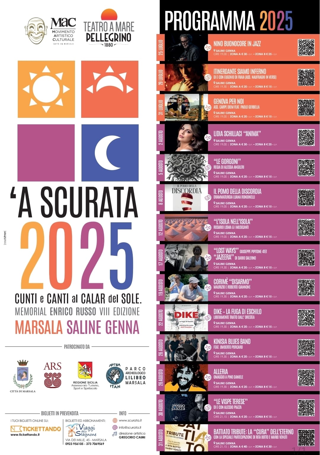 Sono questi i tre appuntamenti in cartellone della settimana dell’VIII edizione della Rassegna “’a Scurata cunti e canti al calar del Sole – Memorial Enrico Russo” manifestazione ideata e organizzata dal Movimento artistico culturale città di Marsala - M.A.C. Il teatro a mare “Pellegrino 1880”, unico completamente “green”, fatto unicamente di tufi e sale, con sedute di legno, e realizzato in una vasca delle antiche Saline Genna, nel cuore della riserva naturale dello Stagnone, accoglierà dalle ore 19, con l’incantevole e variopinto dello scenario del tramonto del Sole sulle Egadi che si riflette sugli specchi d’acqua e sale, performance teatrali e musicali capaci di incantare ogni tipo di pubblico.