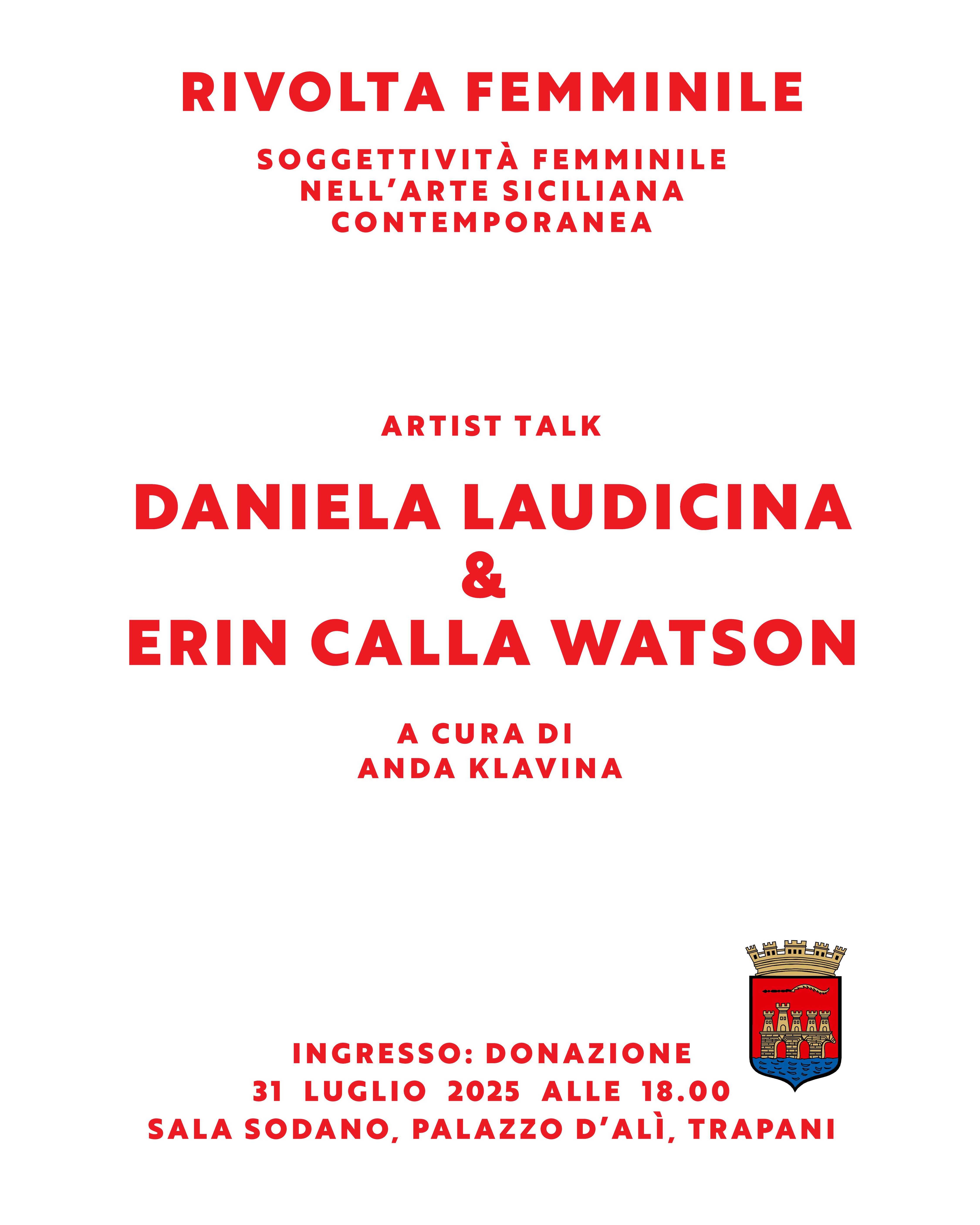 A dialogare con loro sarà la curatrice Anda Klavina. Daniela Laudicina, dopo una lunga esperienza all’estero, lavora oggi con il collage, fondendo pittura, fotografia e arti grafiche. La sua ricerca esplora il potenziale poetico della frammentazione e della ricomposizione dell’immagine. Erin Calla Watson, MFA presso il California Institute of the Arts, interviene con fotografie digitalmente alterate su ambienti domestici maschili e paesaggi costruiti. Le sue opere indagano la dimensione affettiva repressa negli spazi della quotidianità. L’incontro fa parte di una serie mensile che culminerà nella mostra collettiva Rivolta Femminile, in programma dal 12 settembre al 30 ottobre 2025 presso il Chiostro di San Domenico. Il progetto, nato a Trapani nel 2023, si ispira al manifesto femminista degli anni ’70 e mira a costruire una rete concreta di supporto e visibilità per le artiste legate alla Sicilia. L’evento è realizzato con il sostegno del Comune di Trapani, Laudicina S.R.L., Florian Ruths e 102 Radio Trapani. Ingresso libero con donazione.