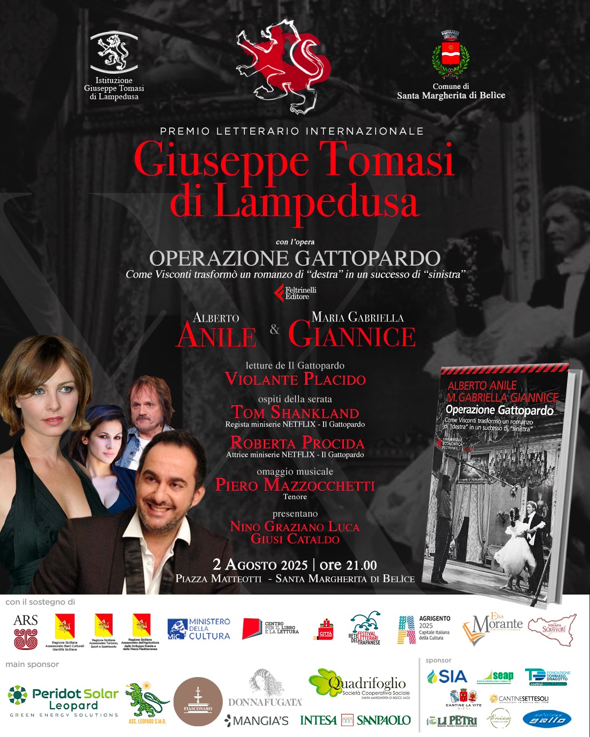 Quest’anno il premio è stato assegnato ad Alberto Anile e Maria Gabriella Giannice per il saggio Operazione Gattopardo, edito da Feltrinelli, che ricostruisce come Luchino Visconti trasformò il romanzo di Tomasi di Lampedusa in un’opera dirompente anche a livello politico. Il 2 agosto, durante la cerimonia ufficiale in piazza Matteotti, gli autori riceveranno il riconoscimento alla presenza di ospiti d’eccezione: l’attrice Violante Placido, il regista Tom Shankland e l’attrice Roberta Procida – protagonisti della nuova serie Netflix Il Gattopardo – e il tenore Piero Mazzocchetti. Conducono la serata Nino Graziano Luca e Giusi Cataldo, che presenterà anche il suo nuovo cortometraggio Ha toccato. L’evento si inserisce nel ricco cartellone del Festival che omaggia anche due anniversari importanti: i cento anni dalla nascita di Andrea Camilleri e i cinquant’anni dalla pubblicazione di Horcynus Orca di Stefano D’Arrigo. Un focus sarà dedicato inoltre al paesaggio siciliano, con un confronto tra esperti sul Giardino del Gattopardo e il valore culturale del territorio.
