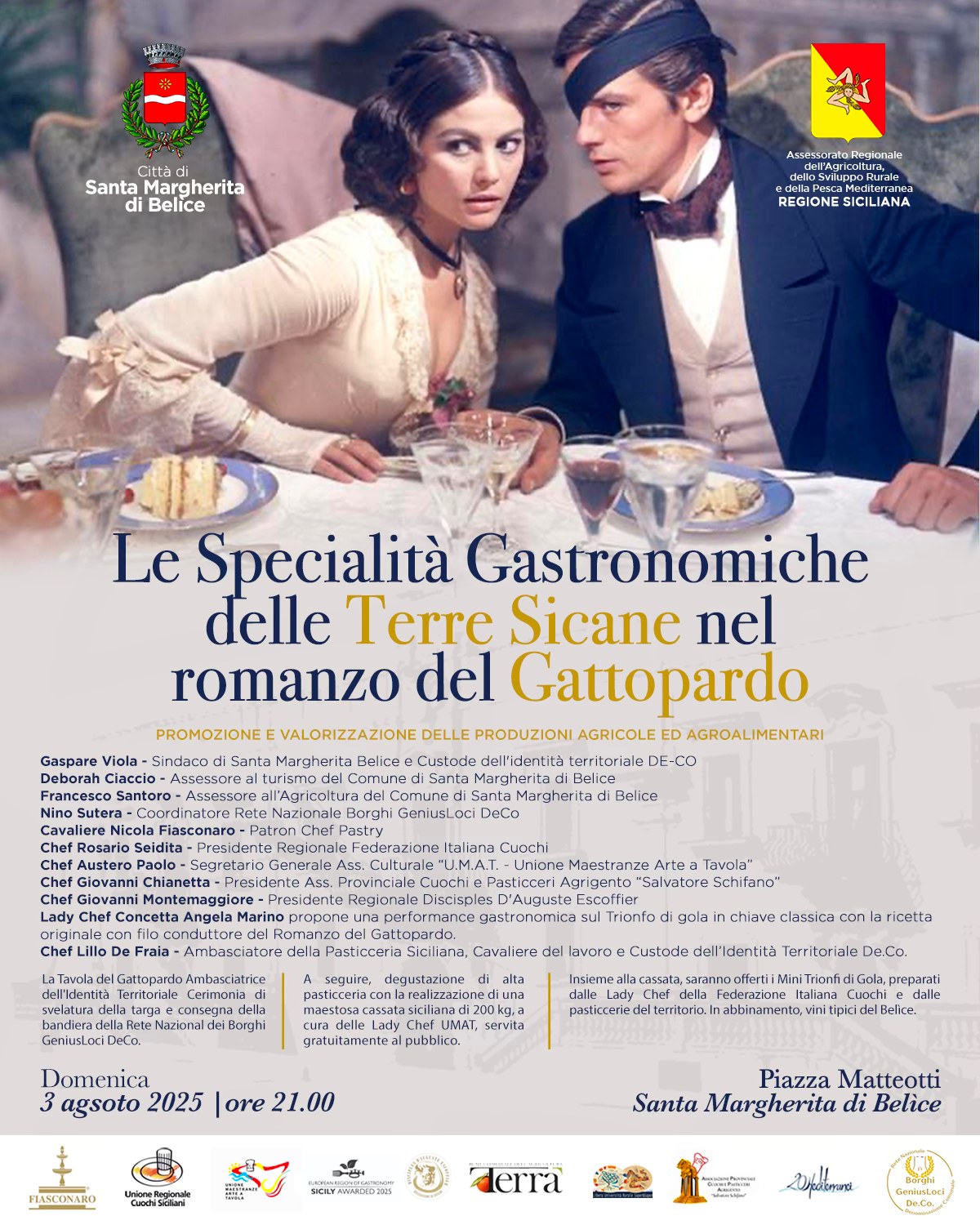 Il 3 agosto il festival si chiude con “La Cucina del Gattopardo”, una serata enogastronomica che celebra la tradizione dolciaria siciliana con il “Trionfo di Gola” del maestro Nicola Fiasconaro e una mega cassata realizzata da una brigata di pasticcerie al femminile. Sarà inaugurata anche l’Enoteca del Gattopardo, in collaborazione con la Strada del Vino delle Terre Sicane. Il Festival, organizzato dal Comune di Santa Margherita di Belìce con l’Istituzione Tomasi di Lampedusa, è riconosciuto come uno dei “Grandi Eventi” della Regione Siciliana e inserito nella Rete dei Festival Letterari 2025.