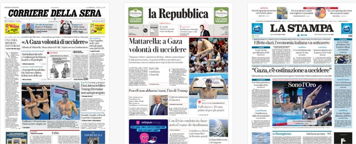 Titoli Corriere della Sera: «A Gaza volontà di uccidere» la Repubblica: Mattarella: «A Gaza / volontà di uccidere» La Stampa: «Gaza, c’è ostinazione a uccidere» Il Sole 24 Ore: Effetto dazi, il Pil Usa torna a salire / Frenata per Italia e Germania (-0,1%) Avvenire: Riconoscer(sì) Il Messaggero: Roma, i poteri di una capitale Il Giornale: Putin sfida Mattarella / Il Quirinale rilancia Leggo: Israele e Russia, Mattarella alza la voce Qn: Mattarella attaccato da Mosca / Il Colle: Russia macigno sull’Ue Il Fatto: Buttano 42 mld in armi / E il Pil precipita a -0,1% Libero: «Forza Italia avrà / un nuovo manifesto» La Verità: Le ricette suicide della sinistra sui dazi Il Mattino: Mattarella su Gaza: intollerabile / Meloni a Netanyahu: «Ora basta» il Quotidiano del Sud: Mattarella: «Mosca cancella la pace» il manifesto: Ostinati / a uccidere Domani: Per l’Ue Gaza è come Auschwitz / Mattarella: «Israele disumano»