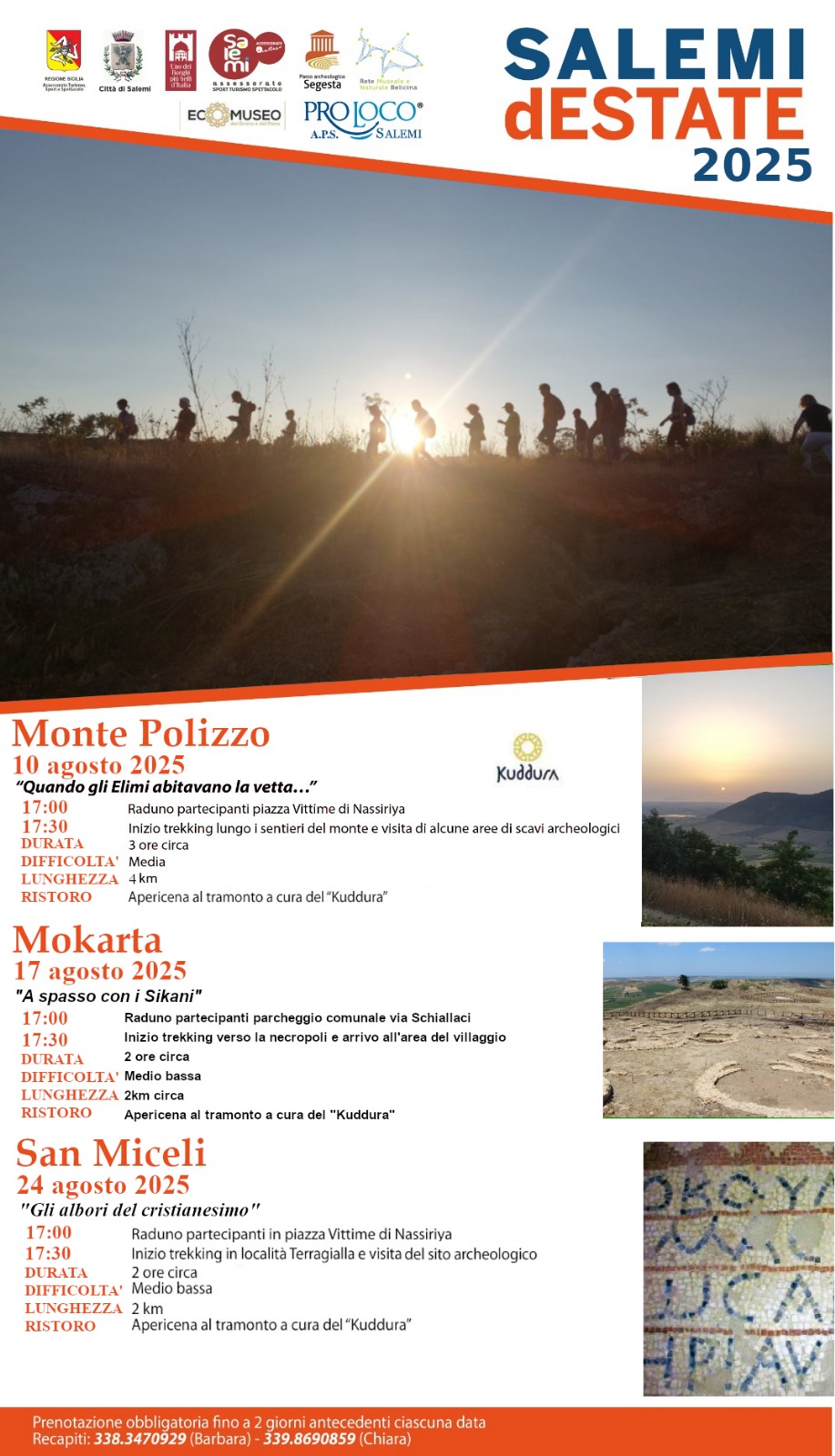 Il primo appuntamento “Quando gi Elimi abitavano la vetta…” e’ fissato per le ore 17:00 del 10 agosto in piazza Vittime di Nassirya e prevede la visita a Monte Polizzo, sito satellite di Segesta di fondazione elima.