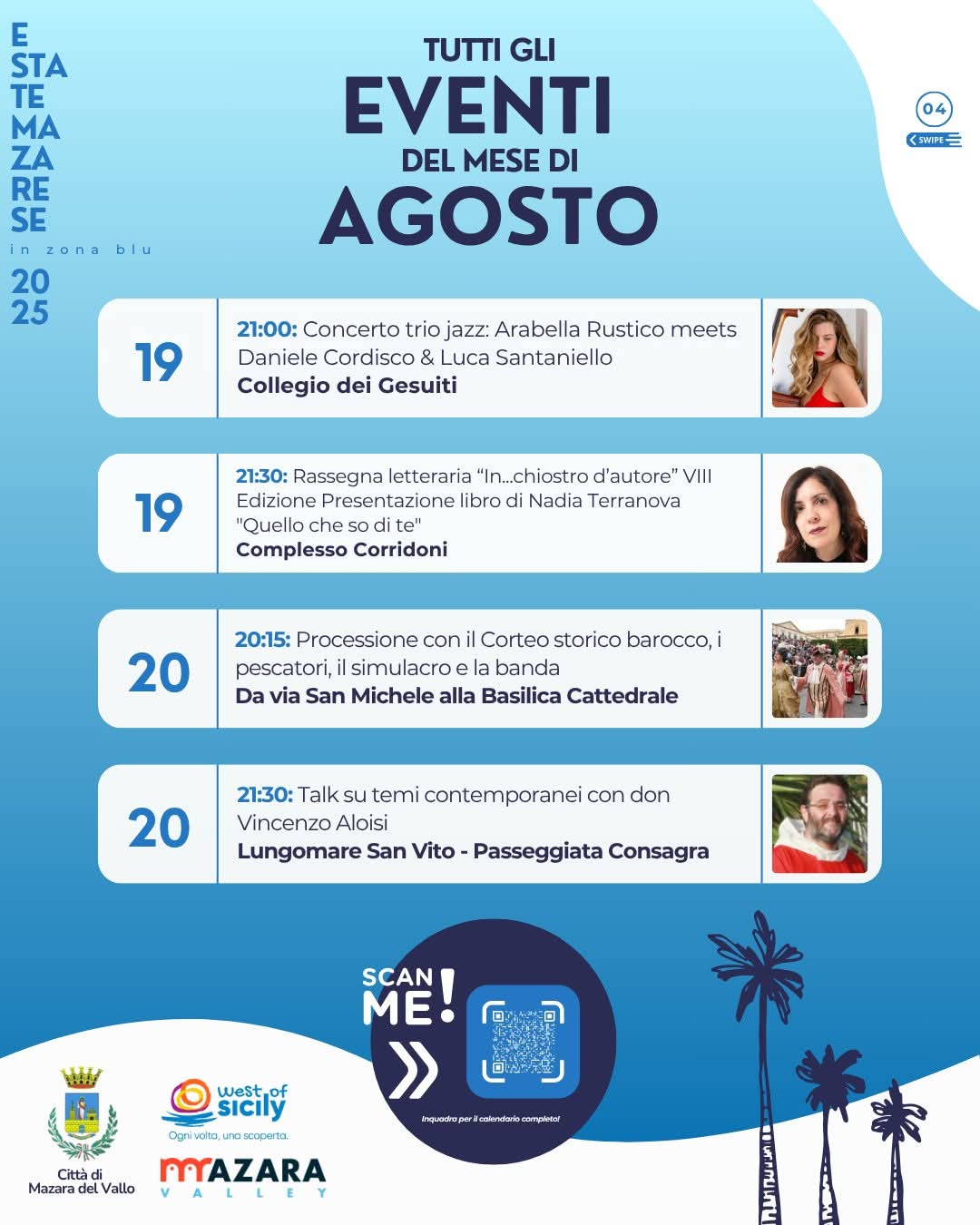 Non mancherà l’arte contemporanea: in piazza della Repubblica, l’artista Manuela Marascia esporrà alcune delle sue opere più suggestive, ispirate alla Sicilia, al mare e alle sue tradizioni, ma non solo, offrendo uno sguardo ricco di colore, emozione e memoria.