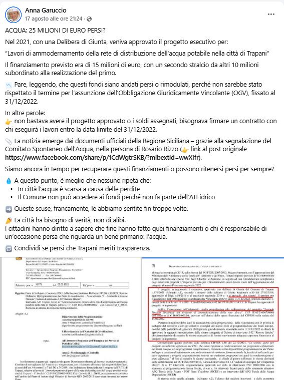 Ad aggiungere benzinasul fuoco è chi solleva il caso. Non l’opposizione, ma Anna Garuccio, tesserata del Pd, partito che governa la città con Tranchida. Attivista del comitato cittadino "L'acqua è un diritto di tutti ", Garuccio sul suo profilo ha scritto senza mezzi termini: “Pare che questi fondi siano andati persi o rimodulati, perché non sarebbe stato rispettato il termine per l’assunzione dell’Obbligazione Giuridicamente Vincolante (OGV)”. Un’accusa pesante, che arriva dall’interno della stessa maggioranza e che metterebbe in imbarazzo il Comune. La Garuccio chiede chiarezza: “La città ha bisogno di verità, non di alibi. I cittadini hanno diritto di sapere che fine hanno fatto quei finanziamenti”.