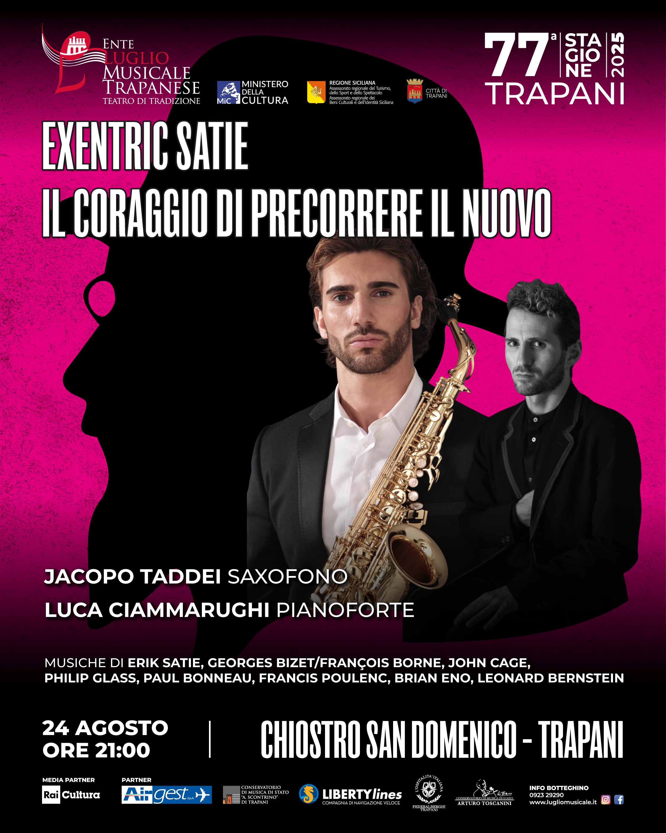 Da Erik Satie a Leonard Bernstein, un secolo di avanguardie musicali in scena domenica 24 agosto, alle ore 21.00, al Chiostro San Domenico a Trapani. Protagonisti del concerto "Excentric Satie - Il coraggio di precorrere il nuovo" Jacopo Taddei al sassofono e Luca Ciammarughi al pianoforte.
