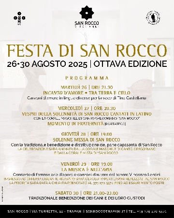 Dopo quasi due secoli di oblìo raggiunge quest’anno la sua ottava edizione la Festa di San Rocco, la cui statua cinquecentesca, di recente restaurata, si trova nella cappella dell’Oratorio di San Rocco in via Turretta 12, nel cuore del centro storico di Trapani.