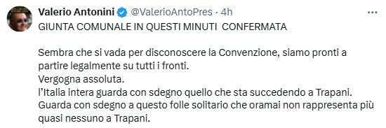 “Sembra che si vada per disconoscere la Convenzione, siamo pronti a partire legalmente su tutti i fronti. Vergogna assoluta. L’Italia intera guarda con sdegno quello che sta succedendo a Trapani. Guarda con sdegno a questo folle solitario che oramai non rappresenta più quasi nessuno a Trapani”.