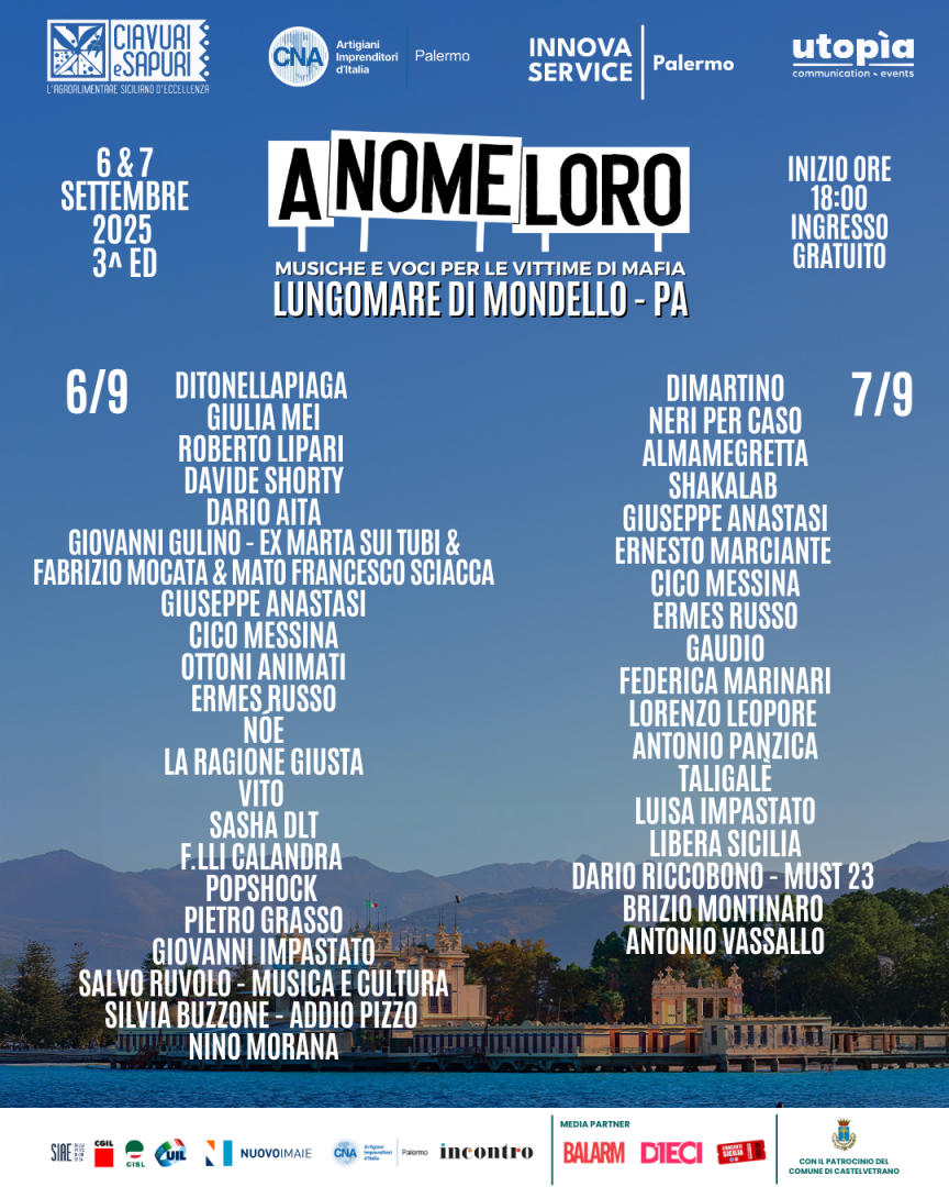 La III edizione di A Nome Loro – Musiche e voci per le vittime di mafia, la maratona artistico- musicale ideata da Sade Mangiaracina che dal 2023 chiama a raccolta nello straordinario scenario i protagonisti della musica italiana ma anche giornalisti impegnati sul fronte della lotta alla criminalità organizzata, attivisti anti-mafia e familiari delle vittime- si terrà sabato 6 e domenica 7 settembre 2025 sul lungomare di Mondello, ospite della manifestazione “Ciavuri e Sapuri” organizzata da CNA Palermo (Artigiani e Imprenditori d’Italia) e Innova Service Palermo S.r.l.