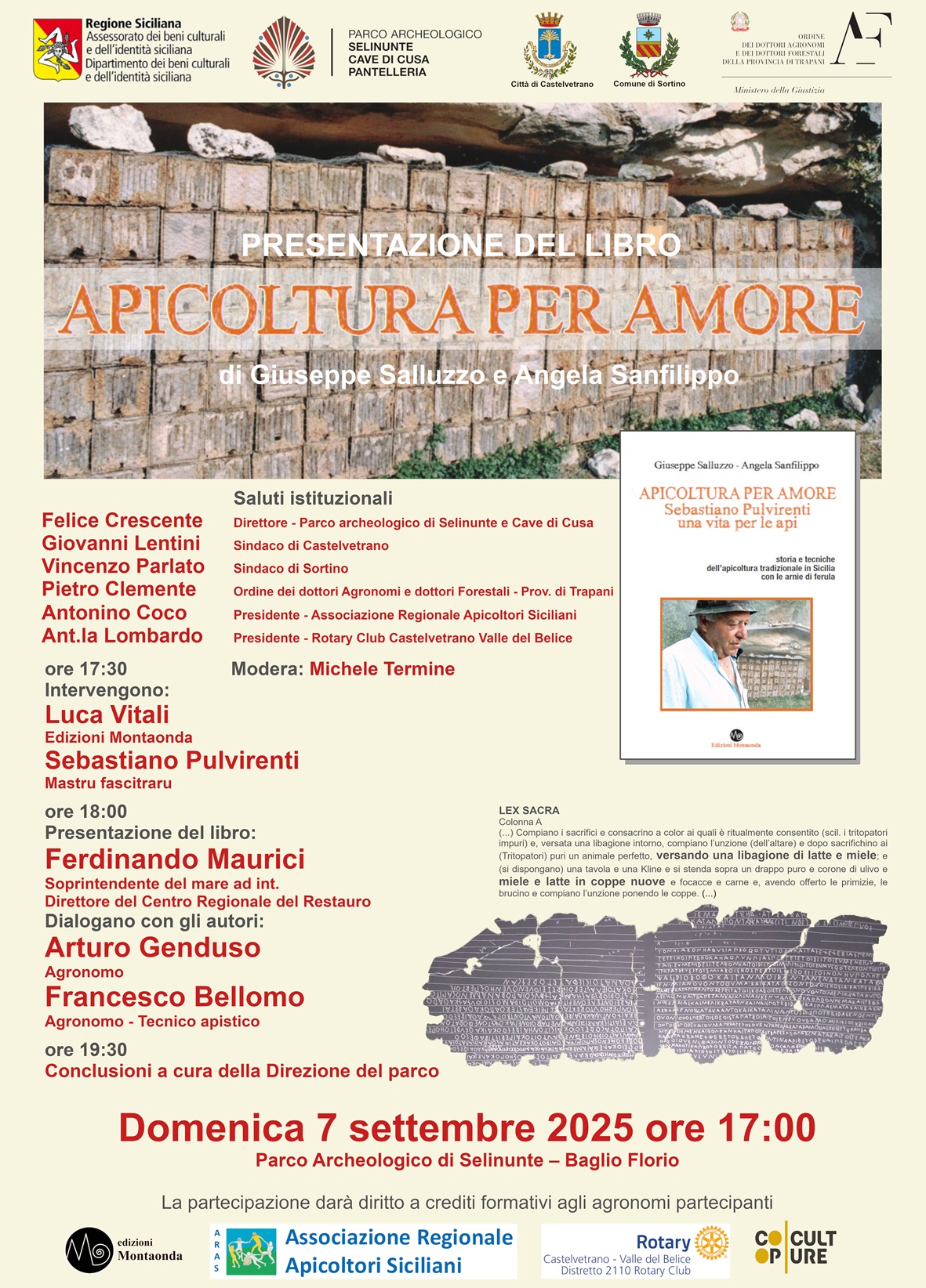 Filo rosso del racconto è Sebastiano Pulvirenti, ultimo mastru fascitraru dei Monti Iblei, una vita spesa ad ascoltare le api. I due autori riescono a dar voce a un amore antico, commovente: Sebastiano Pulvirenti racconta la sua vita, dall’infanzia a Sortino (in una famiglia di fascitrari e ceraioli) fino al riconoscimento della sua professione. Poi il ciclo delle api, la costruzione dell’arnia, i gesti lenti della cura, l’attesa della fioritura, la smielatura, la restituzione alla natura. Il libro è, nello stesso tempo, racconto orale e manuale pratico, fonti classiche e ricerche recenti; e, in appendice, un piccolo dizionario del lessico sortinese dell’apicoltura tra parole arcaiche e significati tecnici che stavano scomparendo: “Apicoltura per amore” è un atto di tutela, di saperi, gesti, nomi e strumenti. Saluti del direttore del Parco, Felice Crescente, dei sindaci di Castelvetrano, Giovanni Lentini, e di Sortino, Vincenzo Parlato; di Pietro Clemente dell’Ordine degli Agronomi – Trapani; di Antonino Coco, presidente dell’Associazione regionale apicoltori siciliani, Antonella Lombardo, presidente del Rotary Club Castelvetrano Valle del Belice. Modera Michele Termine. Dopo un intervento dell’editore Luca Vitali, racconterà la sua esperienza proprio Sebastiano Pulvirenti (Mastru fascitraru e Tesoro Umano Vivente inserito nel registro del REIS).