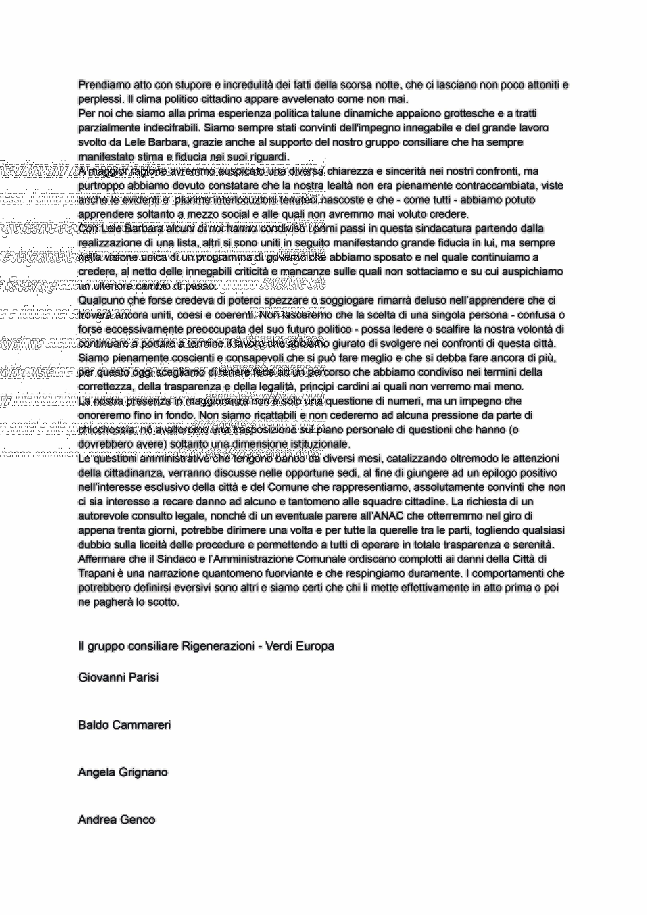 Rigenerazioni-Verdi Europa assicura, dunque, compattezza e sostegno alla maggioranza: “Qualcuno che forse credeva di poterci spezzare o soggiogare rimarrà deluso: ci troverà uniti, coesi e coerenti. Non lasceremo che la scelta di una singola persona – confusa o forse eccessivamente preoccupata del suo futuro politico – possa ledere la nostra volontà di portare avanti il lavoro per la città”.