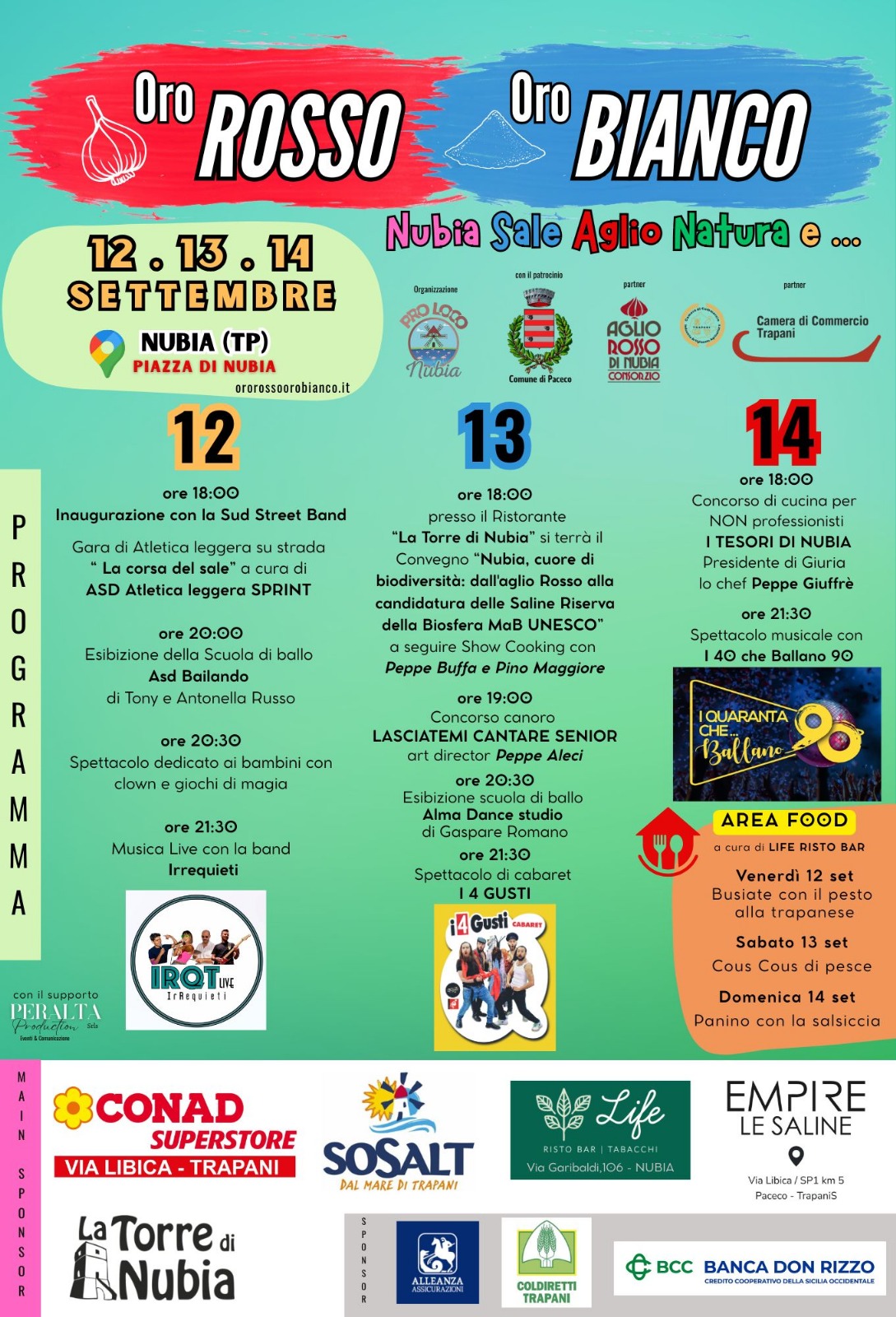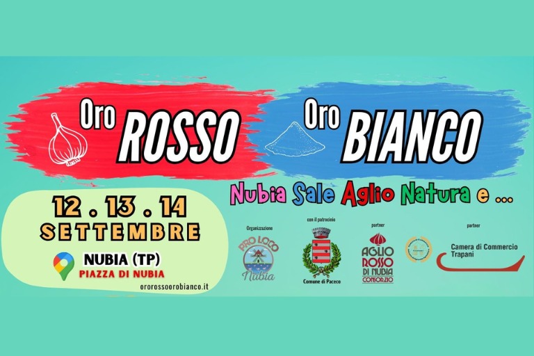 Dal 12 al 14 settembre Nubia ospiterà la manifestazione “Oro Rosso, Oro Bianco”, promossa dalla Pro Loco di Nubia APS con il patrocinio del Comune di Paceco, della Camera di Commercio di Trapani, del Consorzio di Tutela dell’Aglio Rosso di Nubia e con il supporto della Peralta Production.