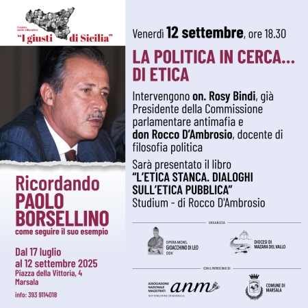 Il tema scelto è “La politica in cerca di… etica”. Interverranno l’onorevole Rosy Bindi, già presidente della Commissione parlamentare antimafia e ministro della Sanità, che parteciperà in collegamento telefonico, e il professor Rocco D’Ambrosio, docente di filosofia politica alla Pontificia Università Gregoriana e autore del volume “L’etica stanca. Dialoghi sull’etica pubblica” (Studium Edizioni), che sarà presentato durante la serata. La rassegna è organizzata dall’Opera Mons. Gioacchino Di Leo e dall’Ufficio per i problemi sociali e il lavoro della Diocesi di Mazara del Vallo, con il patrocinio della Sottosezione marsalese dell’Associazione Nazionale Magistrati e del Comune di Marsala.