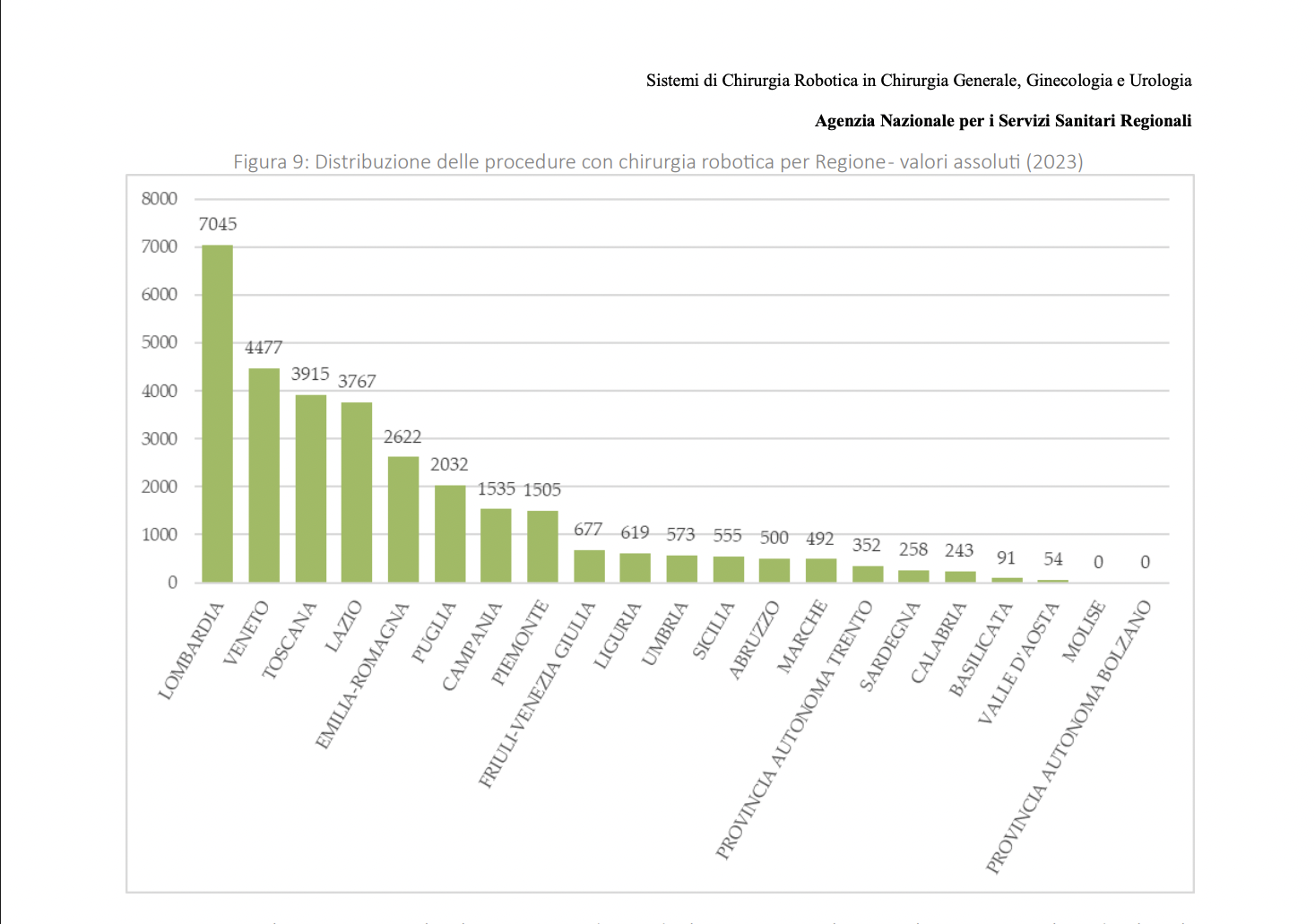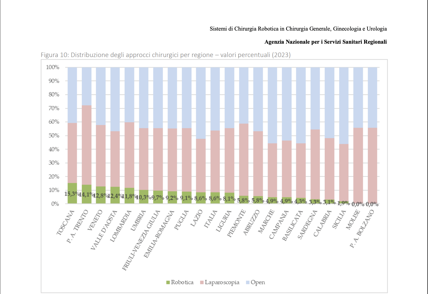 Il documento analizza in modo sistematico lo stato attuale della chirurgia robotica in Italia, confrontandone sicurezza, efficacia, impatto economico, organizzativo ed etico con gli approcci tradizionali laparoscopico e laparotomico. Dal 2018 al 2023 gli interventi robotici in Italia è cresciuto di oltre il 150%. Viene in massima parte utilizzata in urologia, con oltre il 40% dei casi, la chirurgia generale con resezioni coliche e colecistectomie, la ginecologia con le isterectomie e l’ortopedia con le prime protesi di ginocchio e anca eseguite con il supporto robotico. C’è un grande gap nel Paese, sia al nord che al centro Italia la robotica viene ampiamente utilizzata, al sud invece si è ancora indietro.