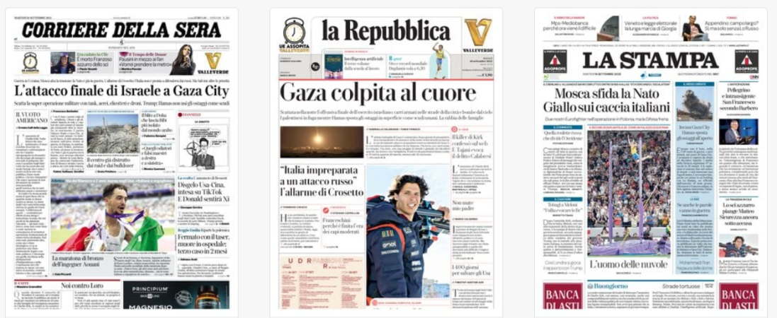 Titoli Corriere della Sera: L’attacco finale di Israele a Gaza City la Repubblica: Gaza colpita al cuore La Stampa: Mosca sfida la Nato / Giallo sui caccia italiani Il Sole 24 Ore: BTp, spread al minimo da 15 anni Il Messaggero: Mosca: Nato in guerra con noi Il Giornale: Israele invade Gaza Qn: Mosca: la Nato è in guerra / Crosetto: Italia impreparata Il Fatto: Kiev ci costerà altri / 120 mld in un anno Libero: Il partito di La7 Avvenire: Corridoi di Salvezza Leggo: Mosca: «Nato in guerra con noi» La Verità: La giudice lo lascia libero / Africano stupra una 18enne Il Mattino: Mosca sfida la Nato: siete in guerra il Quotidiano del Sud: «Nato-Russia, è già guerra» Domani: Putin, grandi manovre e minacce / «Siamo già in guerra con la Nato» Il maninifesto: Quo Vadis