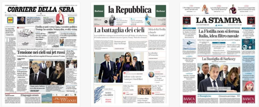 Titoli Corriere della Sera: Tensioni nei cieli sui jet russi la Repubblica: La battaglia dei cieli La Stampa: La Flotilla non si ferma / Italia, idea filtro navale Il Sole 24 Ore: Stablecoin, l’Europa sfida gli Usa Avvenire: Palestina possibile Il Messaggero: Sfida russa nei cieli della Nato Il Giornale: Cercano il morto Qn: Mosca minaccia la Nato / «Se colpite i Mig, è guerra» Il Fatto: Ogni giorno un falso pretesto per la guerra Leggo: Nato-Russia, alta tensione nei cieli Libero: La Flotilla ci porta alla guerra La Verità: La Flotilla getta la maschera Il Mattino: Sfida quantistica, Napoli capitale il Quotidiano del Sud: Putin sfida la Nato nei cieli il manifesto: Sono una Donald Domani: Russia, l’escalation non si ferma / «Se la Nato abbatte i jet è guerra»