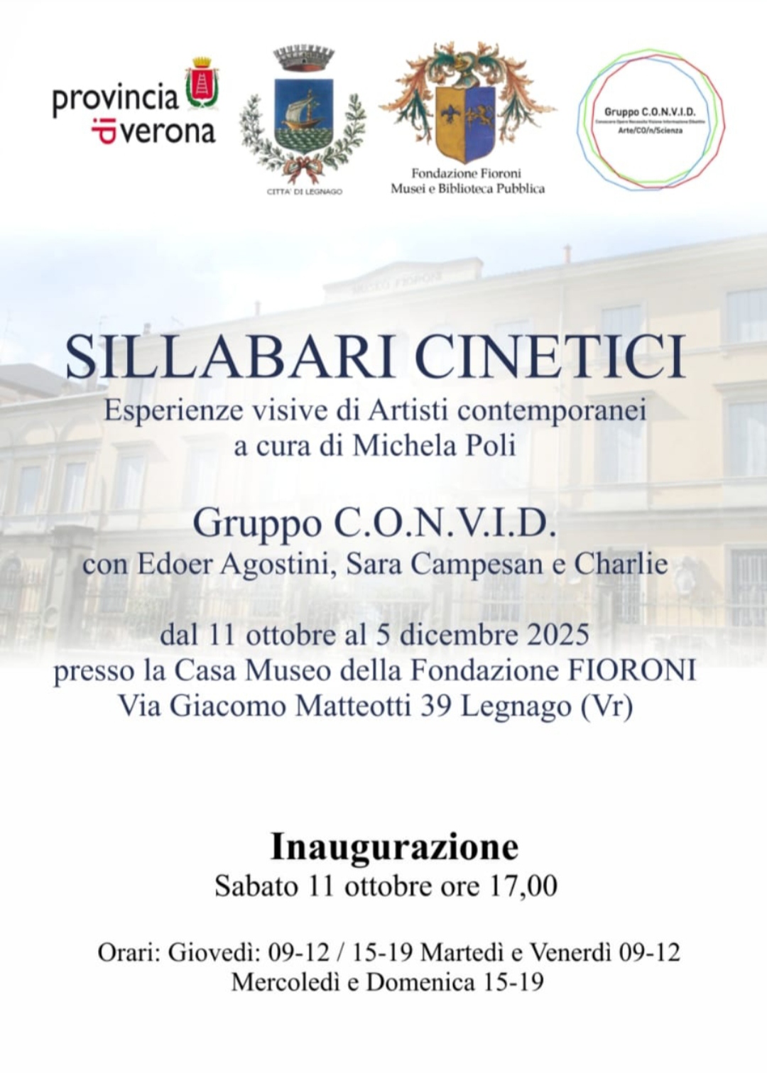 Il Gruppo C.O.N.V.I.D., nato nel 2020, ha già portato la sua ricerca in sedi prestigiose come il Castello Ducale di Bisaccia e la mostra internazionale “Between East and West” in Giappone. A Legnago prosegue la riflessione sulla bellezza del movimento nell’arte, con un corpus di opere che si fonde con l’identità storica e culturale della Fondazione Fioroni.