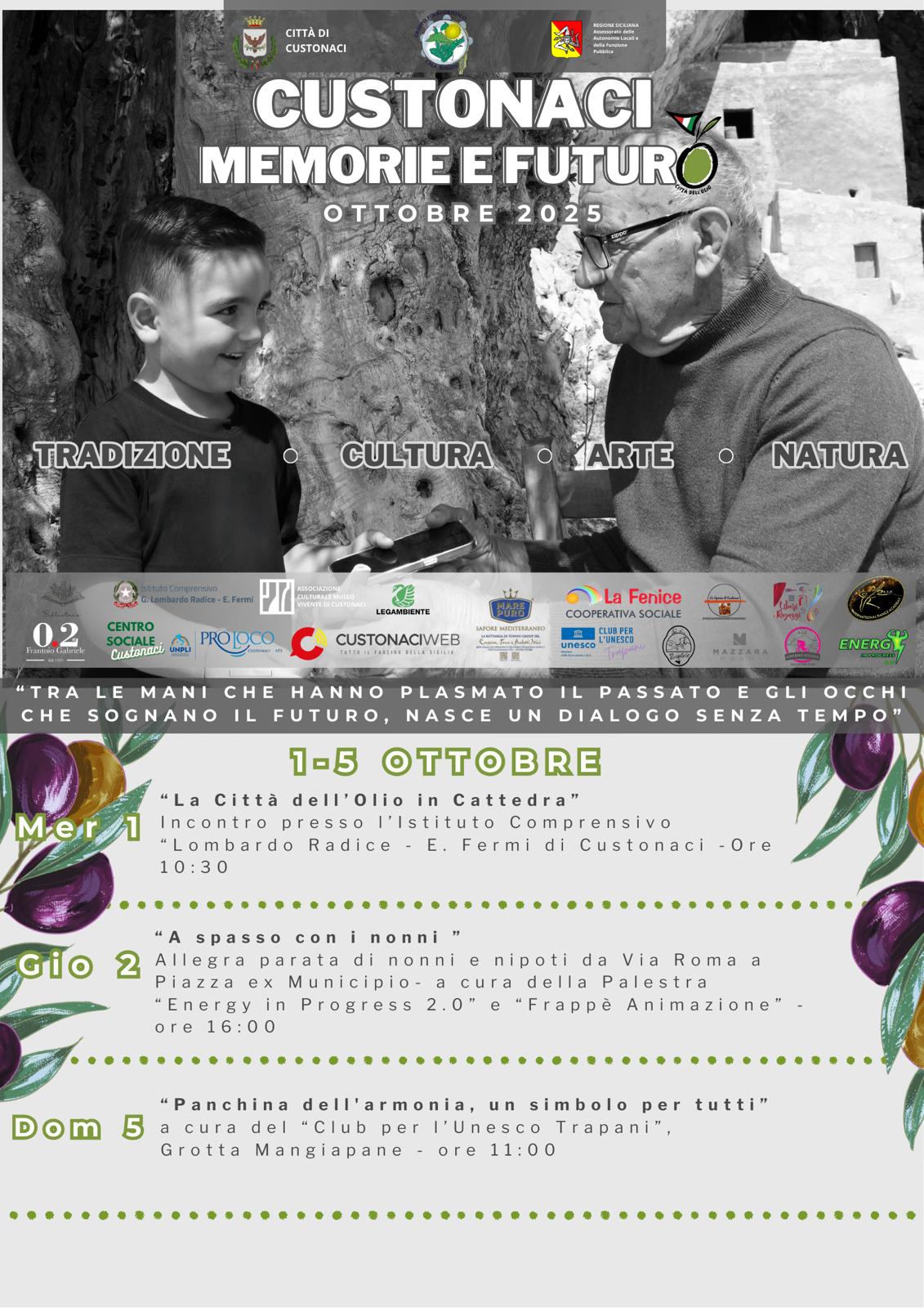 Dal 1° ottobre prende il via la seconda edizione di Custonaci Memorie e Futuro, un progetto innovativo che vede il Comune di Custonaci protagonista di una rinascita culturale e sociale, con il supporto dell’Assessorato delle Autonomie Locali e della Funzione Pubblica della Regione Siciliana. L'iniziativa, che si estende per un intero mese di eventi, ha l'obiettivo di rivitalizzare il patrimonio locale, creando legami tra generazioni e rafforzando la coesione sociale.