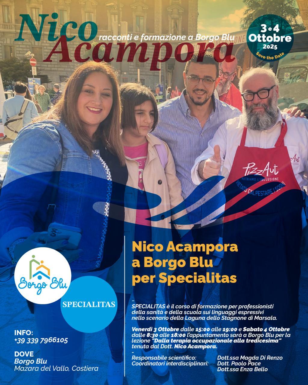 L’incontro Il 3 e 4 ottobre arriverà a Mazara Nico Acampora, fondatore di PizzAut e simbolo concreto di inclusione sociale e lavorativa. Acampora, conosciuto per avere creato la prima pizzeria interamente gestita da ragazzi autistici, sarà il protagonista di Specialitas, il corso di formazione rivolto a professionisti della sanità e della scuola, dedicato ai linguaggi espressivi e ai percorsi di crescita personale e collettiva. Il suo intervento – intitolato “Dalla terapia occupazionale alla tredicesima” – offrirà uno sguardo concreto su come l’inclusione possa trasformarsi da progetto educativo a reale opportunità di lavoro e autonomia. L’iniziativa si svolgerà a Borgo Blu, venerdì 3 ottobre, dalle 15:00 alle 19:00, e sabato 4 ottobre, dalle 8:30 alle 18:00. La direzione scientifica è affidata alla dott.ssa Magda Di Renzo responsabile del progetto, mentre il coordinamento interdisciplinare è curato dal dottor Paolo Pace e dalla dottoressa Enza Bello.
