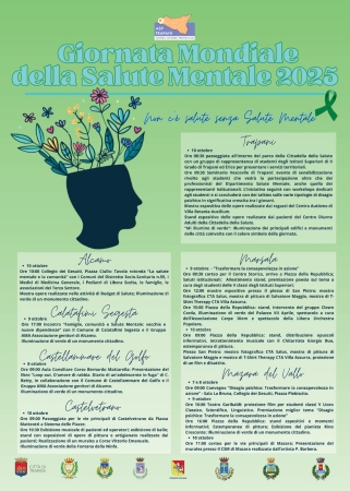 In occasione della Giornata Mondiale della Salute Mentale 2025, l’Azienda Sanitaria Provinciale di Trapani, attraverso il Dipartimento di Salute Mentale, ha organizzato una serie di eventi che coinvolgeranno l’intero territorio trapanese. Nella città di Mazara del Vallo, con il patrocinio del Comune, il cuore delle celebrazioni sarà rappresentato da un convegno di due giornate, in programma il 7 e l’8 ottobre presso la “Sala La Bruna” del Collegio dei Gesuiti, in Piazza Plebiscito.