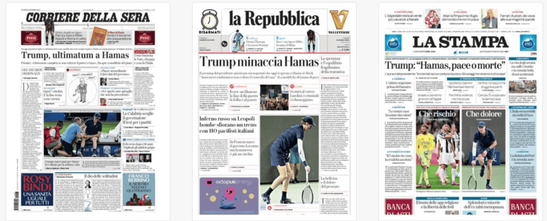 Titoli Corriere della Sera: Trump, ultimatum a Hamas la Repubblica: Trump minaccia Hamas La Stampa: Trump: «Hamas, pace o morte» Il Sole 24 Ore: Frane e alluvioni / Cresce del 15% / il territorio italiano / a rischio dissesto Il Messaggero: Gaza, primi passi per la pace Il Giornale: Flotilla, la verità sugli aiuti / «Neanche mezzo camion» Leggo: Gaza, l’ultimatum di Trump Qn: Gaza, il vertice decisivo / Trump minaccia Hamas Il Fatto: La patacca dei fondi di Hamas/ a Flotilla: Un foglio di 4 anni fa Libero: La fatwa anti Libero La Verità: Compagni che sbagliano? No, maranza che sfasciano Il Mattino: Sempre in vetta il Quotidiano del Sud: Sud, ripartire per non partire Domani: Piano per Gaza, i giorni decisivi / Hamas: «Restituiremo gli ostaggi»