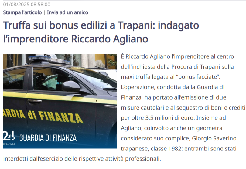 Il G.I.P. del Tribunale di Trapani ha emesso un'ordinanza di applicazione di misura cautelare personale e un decreto di sequestro preventivo nei confronti di Riccardo Agliano e Giorgio Saverino. Agliano, in qualità di rappresentante legale della società Holding G.I.G.R.A Service srl, e Saverino, in qualità di progettista e direttore dei lavori, sono indagati per truffa aggravata ai danni dello Stato, emissione di fatture per operazioni inesistenti, truffa ai danni dei condomini e autoriciclaggio. Come tutto sia stato reso possibile, lo racconteremo domani.