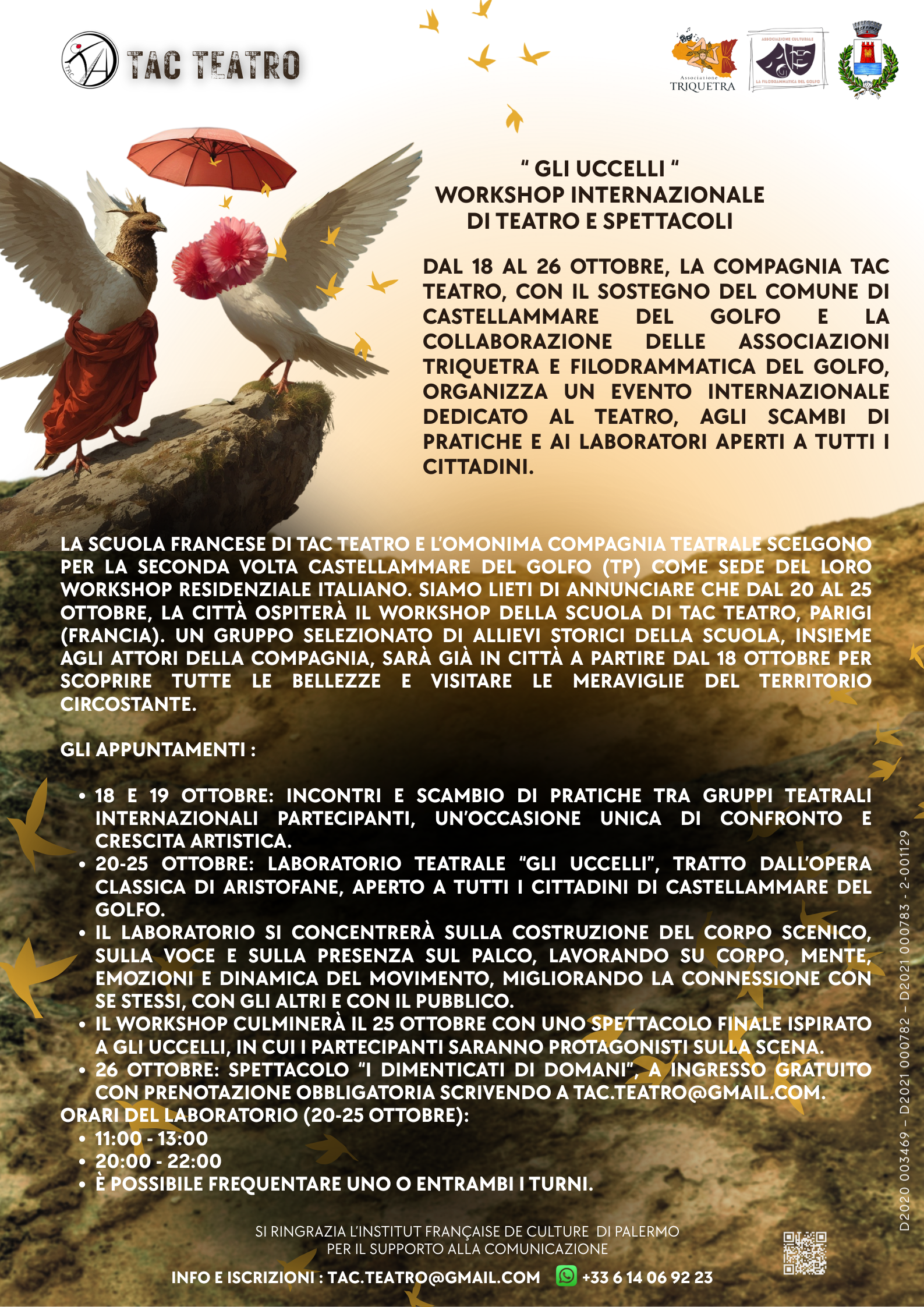 A Castellammare del Golfo “Gli Uccelli”, il workshop internazionale di teatro e spettacoli in programma dal 18 al 26 ottobre 2025. L’iniziativa, organizzata dalla compagnia TAC Teatro di Parigi con il sostegno del Comune di Castellammare del Golfo e la collaborazione delle associazioni Triquetra e Filodrammatica del Golfo, rappresenta un importante momento di incontro tra artisti, cittadini e appassionati di teatro provenienti da diverse parti del mondo.