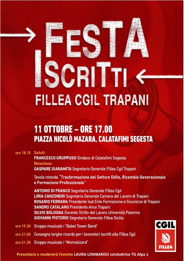 Si terrà sabato 11 ottobre, in piazza Nicolò Mazara a Calatafimi Segesta, la prima Festa provinciale degli edili Fillea Cgil Trapani, un appuntamento dedicato al tema “Trasformazione del settore edile, ricambio generazionale e formazione professionale”.