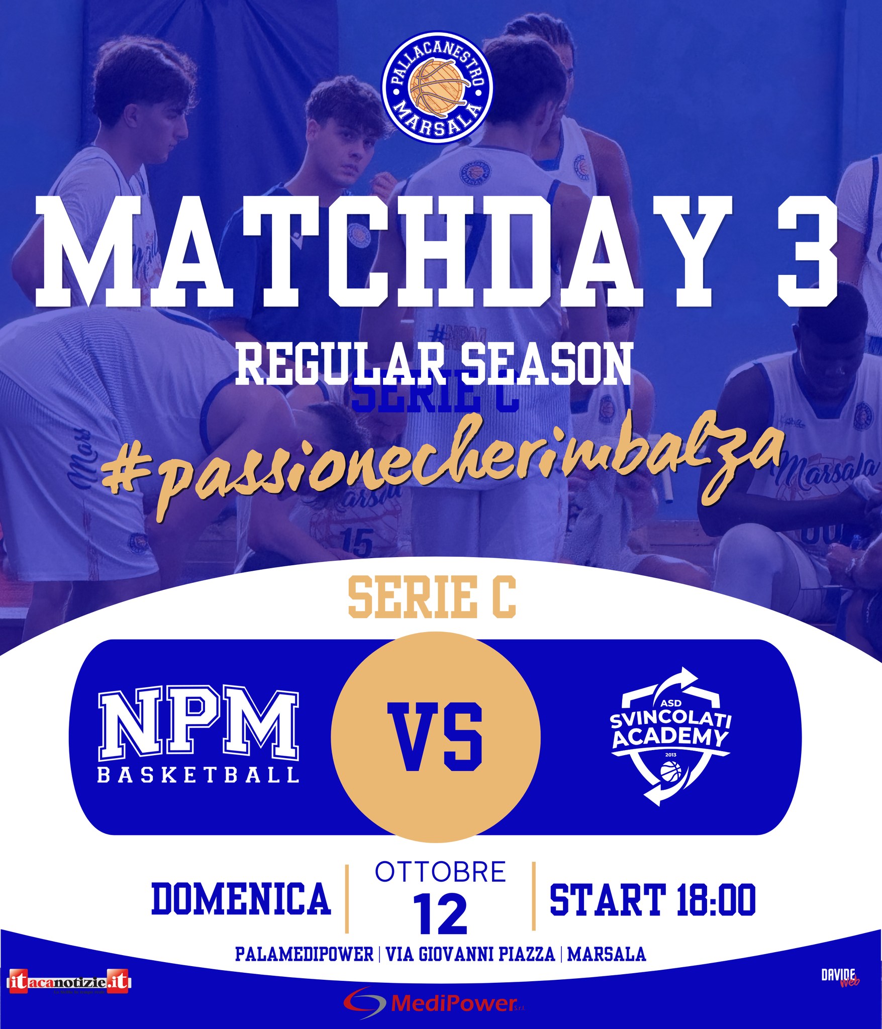 • Basket serie C – Terza giornata di Campionato per la Nuova Pallacanestro Marsala che nel proprio impianto casalingo del Palamedipower affronterà, domenica 12 ottobre con inizio alle ore 18:00 la Svincolati Milazzo. Match decisivo questo per i ragazzi di Coach Grillo che dopo due sconfitte consecutive hanno l’obbligo di cambiare la tendenza e muovere la classifica. Di fronte una squadra coriacea con un gioco dinamico ed aggressivo che renderà la gara intensa e combattuta sin dal primo minuto.