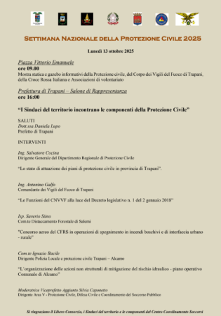 Nel capoluogo, lunedì 13 ottobre, sono previste diverse iniziative coordinate dalla Prefettura di Trapani, con la partecipazione di amministrazioni locali, Vigili del Fuoco, scuole, strutture operative del sistema di protezione civile e associazioni di volontariato.