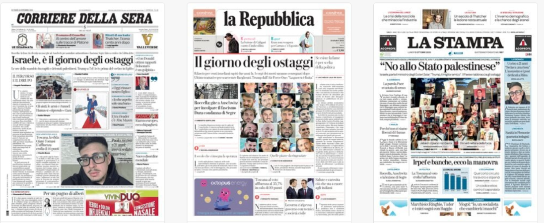 Titoli Corriere della Sera: Israele, è il giorno degli ostaggi la Repubblica: Il giorno degli ostaggi La Stampa: «No allo Stato palestinese» Il Sole 24 Ore: Famiglie italiane, da 13 a 29 stipendi / per azzerare il debito Il Messaggero: Gaza, gli ostaggi verso casa Il Giornale: Il giorno della libertà Leggo: Gaza, il giorno degli ostaggi Qn: Ostaggi, l’ora della libertà / Trump al vertice sulla tregua Il Fatto: Herzog vuole salvare Netanyahu / Che minaccia: «Non finisce qui» Libero: Gli azzurri di Gattuso / nel mirino dei pro-Pal La Verità: Centri sociali ancora in guerra / «Sarà un autunno caldissimo» Il Mattino: Ostaggi a casa, l’attesa di Israele il Quotidiano del Sud: Centro, l’asse che resiste Domani: Israele, è il giorno degli ostaggi / Trump benedice la «sua» pace