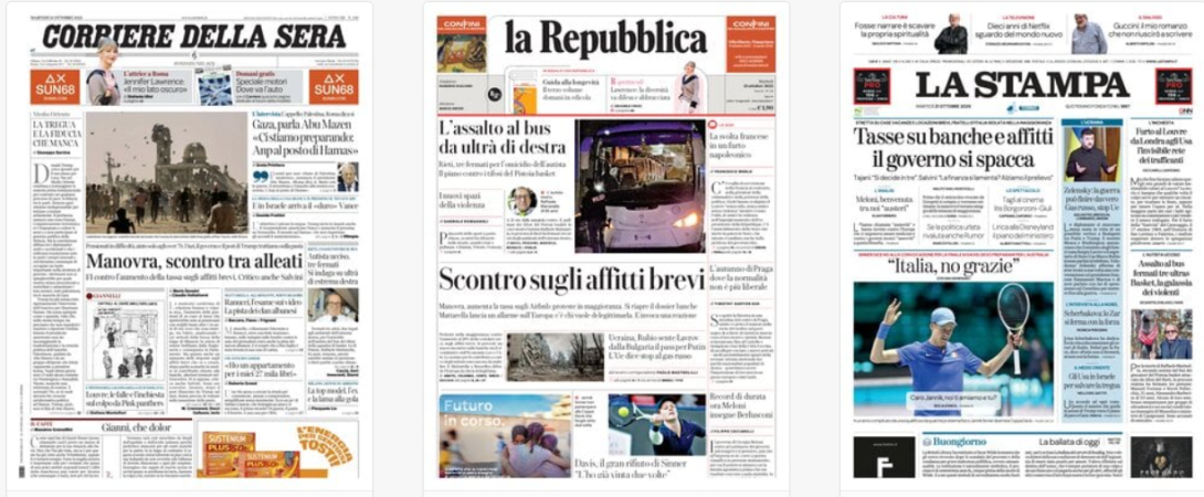 Titoli Corriere della Sera: Manovra, scontro tra alleati la Repubblica: Scontro sugli affitti brevi La Stampa: Tasse su banche e affitti / Il governo si spacca Il Sole 24 Ore: Fisco, dall’Irpef alla casa ecco le novità / Maxi interessi sulla rottamazione Avvenire: Pacchetto famiglia Il Messaggero: Assalto al pullman, tre arresti Il Giornale: Scontro sugli affitti / in pensione dopo / ma stipendi più alti Qn: Scontro sugli affitti brevi / Pensioni, stop a Quota 103 Il Fatto: Trump chiama: Meloni / è più lontana da Kiev Leggo: Autista ucciso, fermati tre ultrà Libero: L’Ue si rimangia il veto / sulle auto a benzina La Verità: «L’Europa ha lavorato per la Cina» il manifesto: La guerra dopo Domani: Affitti brevi, banche e troppe tasse / La destra va in pezzi sulla manovra