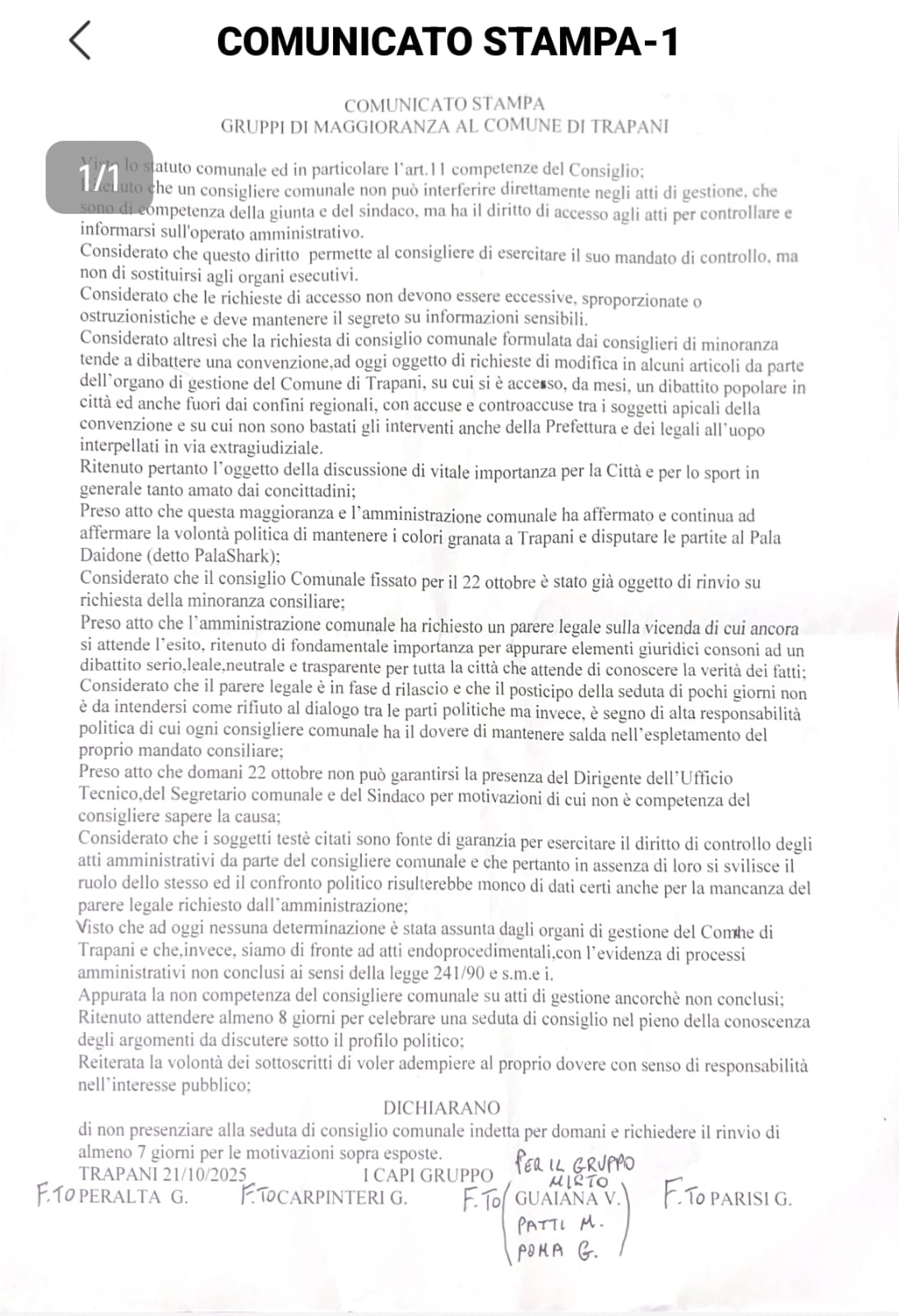 Secondo la maggioranza, si tratta di un tema “di vitale importanza per la città e per lo sport trapanese”, ma il confronto in aula “non può avvenire senza la presenza del Dirigente dell’Ufficio Tecnico, del Segretario comunale e del Sindaco”, figure ritenute necessarie per garantire la completezza delle informazioni e un dibattito trasparente.