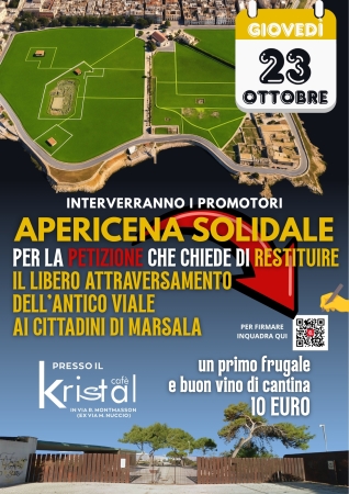Un’apericena solidale per sostenere la petizione che chiede la "riapertura" dell’antico viale della Plateia Aelia, a Marsala. L’appuntamento è per giovedì 23 ottobre, al Kristal Cafè di via R. Montmasson (ex via M. Nuccio). Durante la serata interverranno i promotori della raccolta firme, che dallo scorso inverno chiedono di restituire ai cittadini la possibilità di attraversare liberamente il viale che da Porta Nuova conduce fino al mare, all’interno del Parco archeologico di Lilibeo.