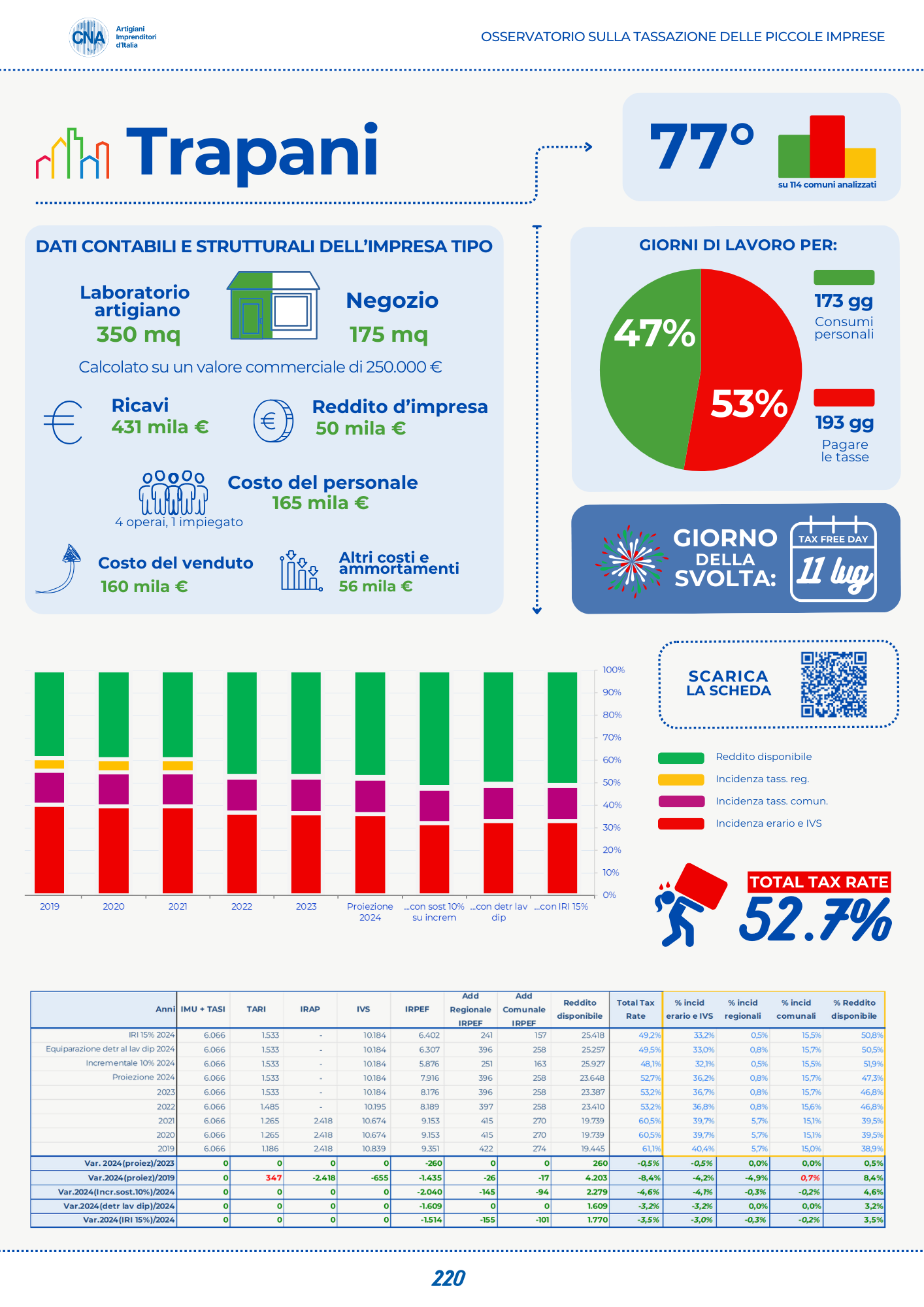 A Trapani, il Total Tax Rate – cioè il peso complessivo di tasse e contributi sul reddito – è del 52,7%, poco sotto la media siciliana (53,1%) ma comunque più alto rispetto alla media nazionale del 52,3%. Tradotto in pratica: le imprese trapanesi hanno dovuto lavorare fino all’11 luglio solo per pagare tasse e imposte.