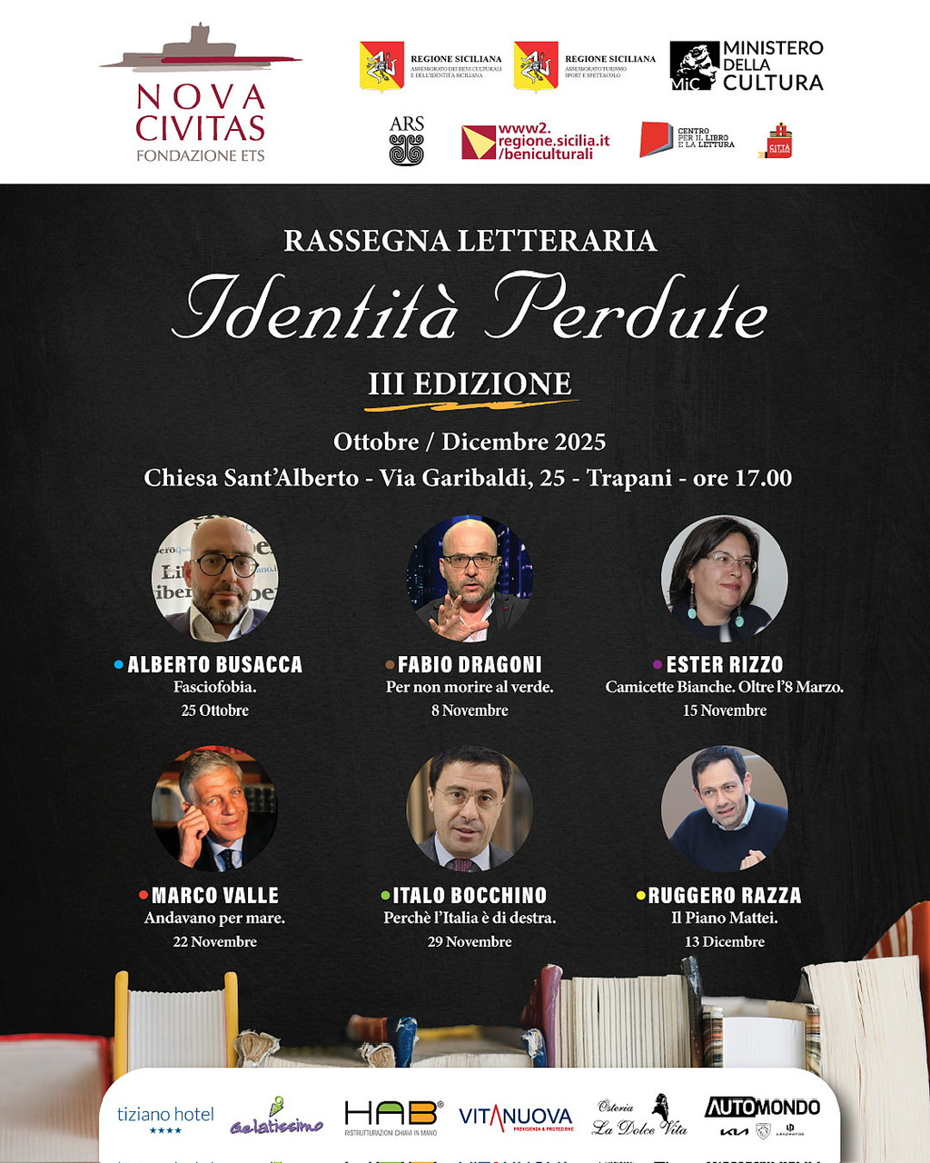 Torna “Identità Perdute”, la rassegna letteraria promossa dalla Fondazione Nova Civitas ETS, giunta quest’anno alla terza edizione. Un percorso tra libri, autori e riflessioni sull’Italia e le sue radici, sostenuto dalla Regione Siciliana (assessorato Beni Culturali e Identità siciliane e assessorato Turismo, Sport e Spettacolo), dall’ARS e dal Ministero della Cultura. Gli incontri si terranno da ottobre a dicembre presso la Chiesa di Sant’Alberto, in via Garibaldi a Trapani, con inizio alle ore 17.