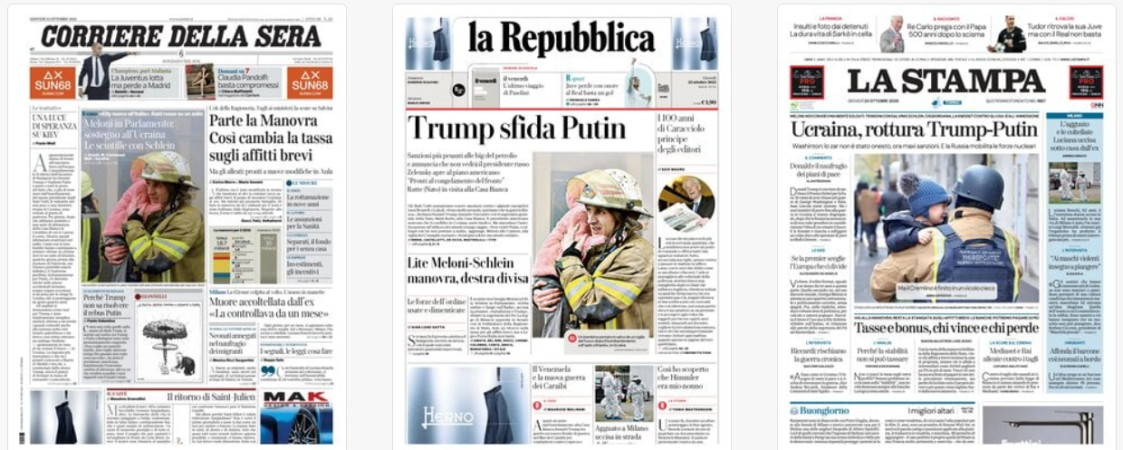 Titoli Corriere della Sera: Parte la Manovra / Così cambia la tassa / sugli affitti brevi la Repubblica: Trump sfida Putin La Stampa: Ucraina, rottura Trump-Putin Il Sole 24 Ore: Rottamazione solo per il 3 per cento del debito / Contributo banche, una parte è a tempo Avvenire: Tocca all’Europa Il Messaggero: Lavoro, meno tasse ai dipendenti Il Giornale: Tutte le verità della Meloni Leggo: Gli italiani tagliano su frutta e verdura Qn: Manovra, battaglia in aula / Scontro su affitti e banche Il Fatto: Indetro / Marsch! Libero: La sinistra s’ammoscia La Verità: Chi sabota l’incontro Trump-Putin Il Mattino: Salari, aumenti e tasse giù / per i lavoratori dipendenti il Quotidiano del Sud: La via stretta di Meloni / Con Trump e con la Ue il manifesto: Il ballo / del mattone Domani: Zelensky apre al compromesso / «Congeliamo la linea del fronte»