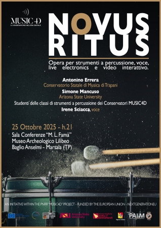 Dopo la prima esecuzione assoluta alla Katzin Hall dell’ASU, Novus Ritus arriva a Marsala per raccontare, attraverso il linguaggio dei suoni, il dialogo tra rito, memoria e contemporaneità. Le musiche originali di Errera, Simone Mancuso e Gabriel Bolaños saranno interpretate dagli stessi compositori insieme alla voce di Irene Sciacca e agli studenti della classe di percussioni del Conservatorio Scontrino: Emanuele Ventimiglia, Eduardo La Scala, Giuseppe Marcantonio e Francesco Prestigiacomo. L’opera fonde strumenti rituali mediterranei – dal riq egiziano ai tamburi a cornice di Sicilia e Nord Africa, fino ai karkabou maghrebini – con gli strumenti della musica colta e sperimentale come gong, marimba e sixxen, questi ultimi ideati dal compositore greco Iannis Xenakis, cui l’opera rende omaggio.