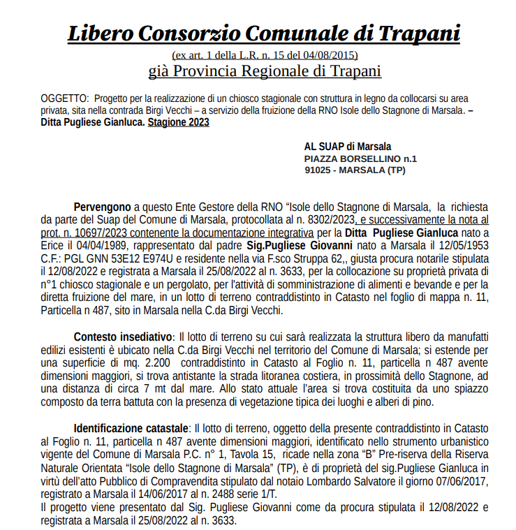 Eppure, tra le pratiche amministrative in corso al Comune, emerge un altro Pugliese. Si tratta della richiesta presentata da Gianluca Pugliese, nato a Erice il 04/04/1989 per la collocazione di un Chiosco in contrada Birgi Vecchi. L'oggetto? La solita formula: "Attività di Rinfresco, Ristoro con Somministrazione e Vendita di Alimenti e Bevande, per la Diretta Fruizione del Mare".