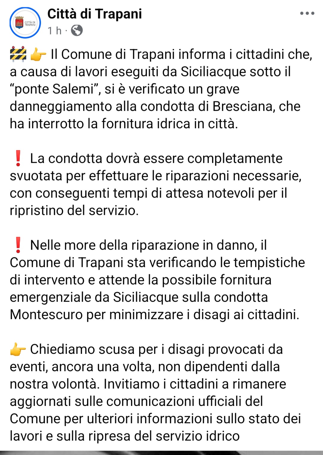 Intanto l’amministrazione prova a correre ai ripari: da un lato monitora i lavori di riparazione, dall’altro attende una fornitura d’emergenza da Siciliacque sulla condotta di Montescuro, per cercare di dare almeno un po’ d’acqua alle famiglie.