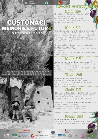 Sta per concludersi “Memorie e Futuro”, il progetto promosso dal Comune di Custonaci insieme al Gruppo Folkloristico Cala Bukuto e finanziato dall’Assessorato regionale delle Autonomie locali. Un’iniziativa che ha animato tutto il mese di ottobre con eventi, laboratori e incontri dedicati alla memoria, alla cultura e alla coesione sociale.