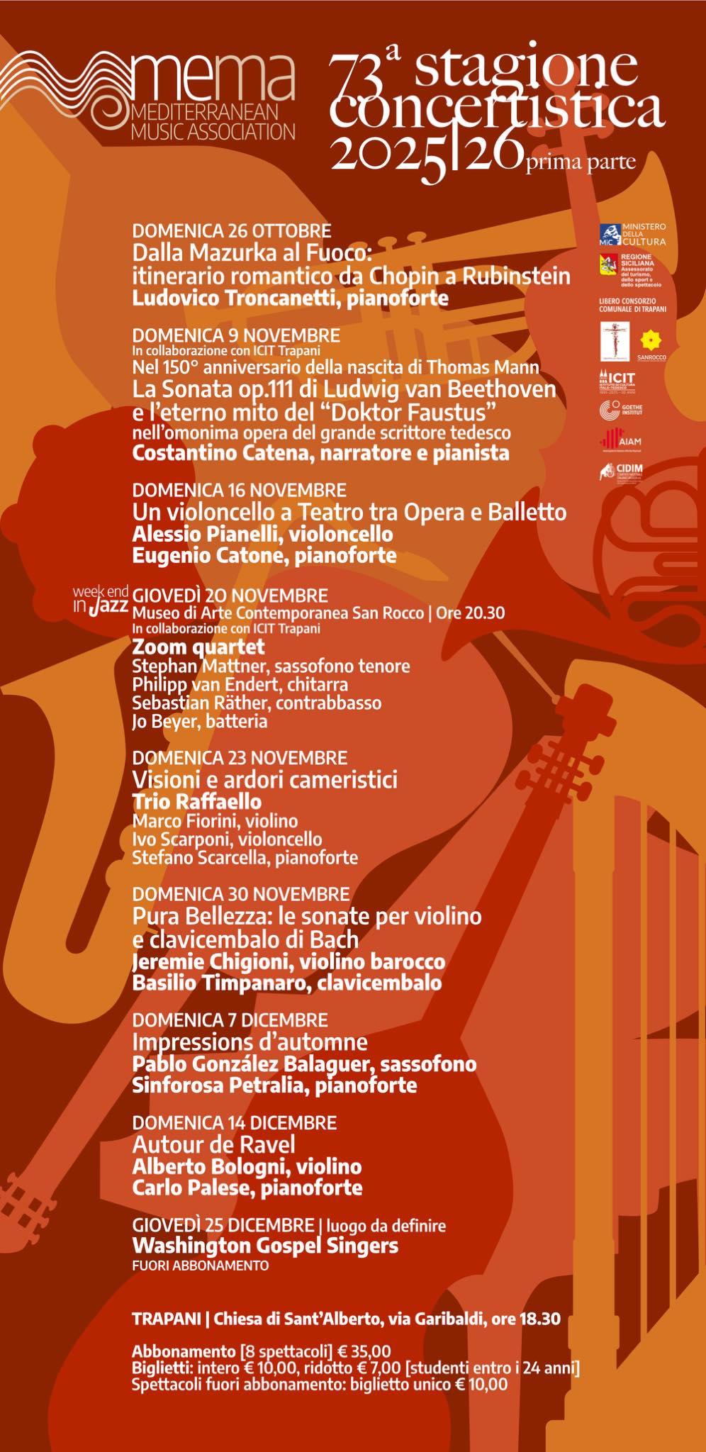 TRAPANI - Domenica 26 ottobre alle 18.30, nella Chiesa di Sant’Alberto a Trapani, si apre la 73ª stagione concertistica della Mema con il recital pianistico “Dalla Mazurka al Fuoco: itinerario romantico da Chopin a Rubinstein”. Protagonista della serata sarà il pianista Ludovico Troncanetti, impegnato in un percorso musicale che attraversa il romanticismo europeo.