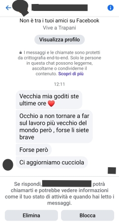 Un messaggio irriguardoso e violento, arrivato alla consigliera comunale e segretaria del circolo Pd di Trapani Marzia Patti... “Goditi le ultime ore da consigliere comunale poi tornerai a fare…”. Il resto della frase è irripetibile: un’offesa volgare, sessista e umiliante, che nulla ha a che vedere con il confronto politico.