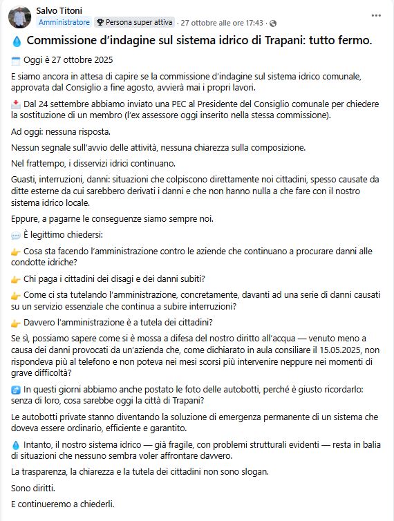 La rabbia cresce perché il servizio sostitutivo dovrebbe essere garantito a ogni interruzione idrica, indipendentemente dalle cause. Alberto Catania, presidente del comitato Trapani Centro, non usa mezzi termini: «È davvero complicato credere a questa risposta, con una determina che parla di accordo quadro per 164.000 euro».