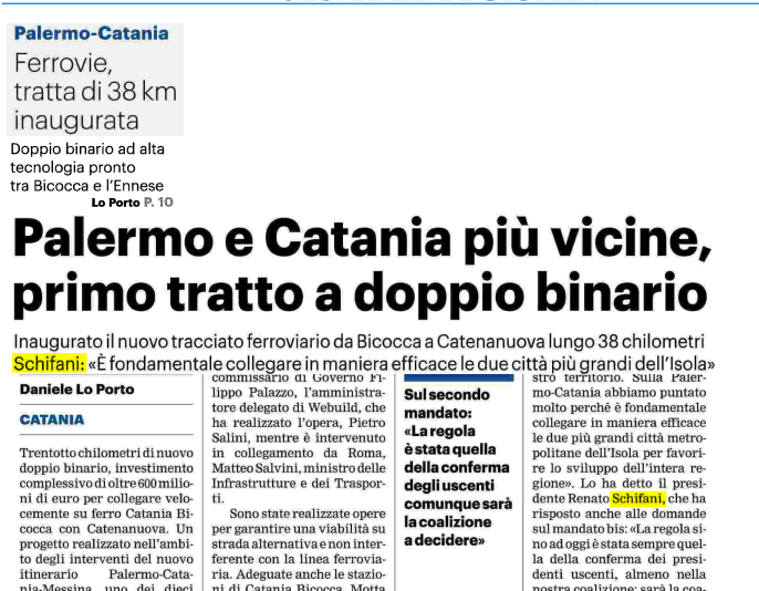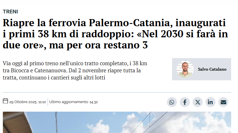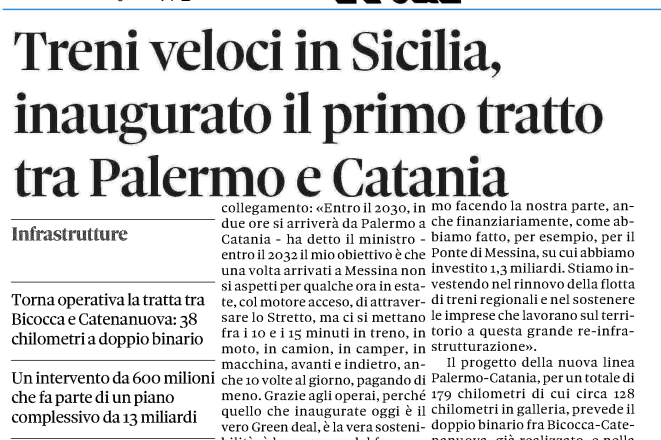 La vera notizia è questa: riapre la ferrovia Palermo-Catania, con l'inaugurazione dei primi 38 chilometri di raddoppio tra Bicocca e Catenanuova.