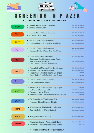 La prevenzione dell’Asp Trapani resta in campo al fianco dei cittadini anche a novembre con lo “Screening in piazza”. Da oggi, 1 novembre, ogni sabato e domenica sarà dedicato alla popolazione nella fascia di età 50/69 anni per la prevenzione del tumore del colon retto. I camper dell’Azienda sanitaria, con personale infermieristico, consegneranno a chi vorrà, e rientra nella fascia di età indicata, il kit per la ricerca del sangue occulto nelle feci, che sarà riconsegnato in una delle farmacie della provincia.