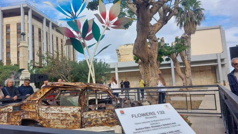 L’installazione, che utilizza i resti della Fiat 132 blindata del giudice Carlo Palermo, sopravvissuto all’attentato, è stata trasformata in un monumento alla memoria e alla rinascita civile.